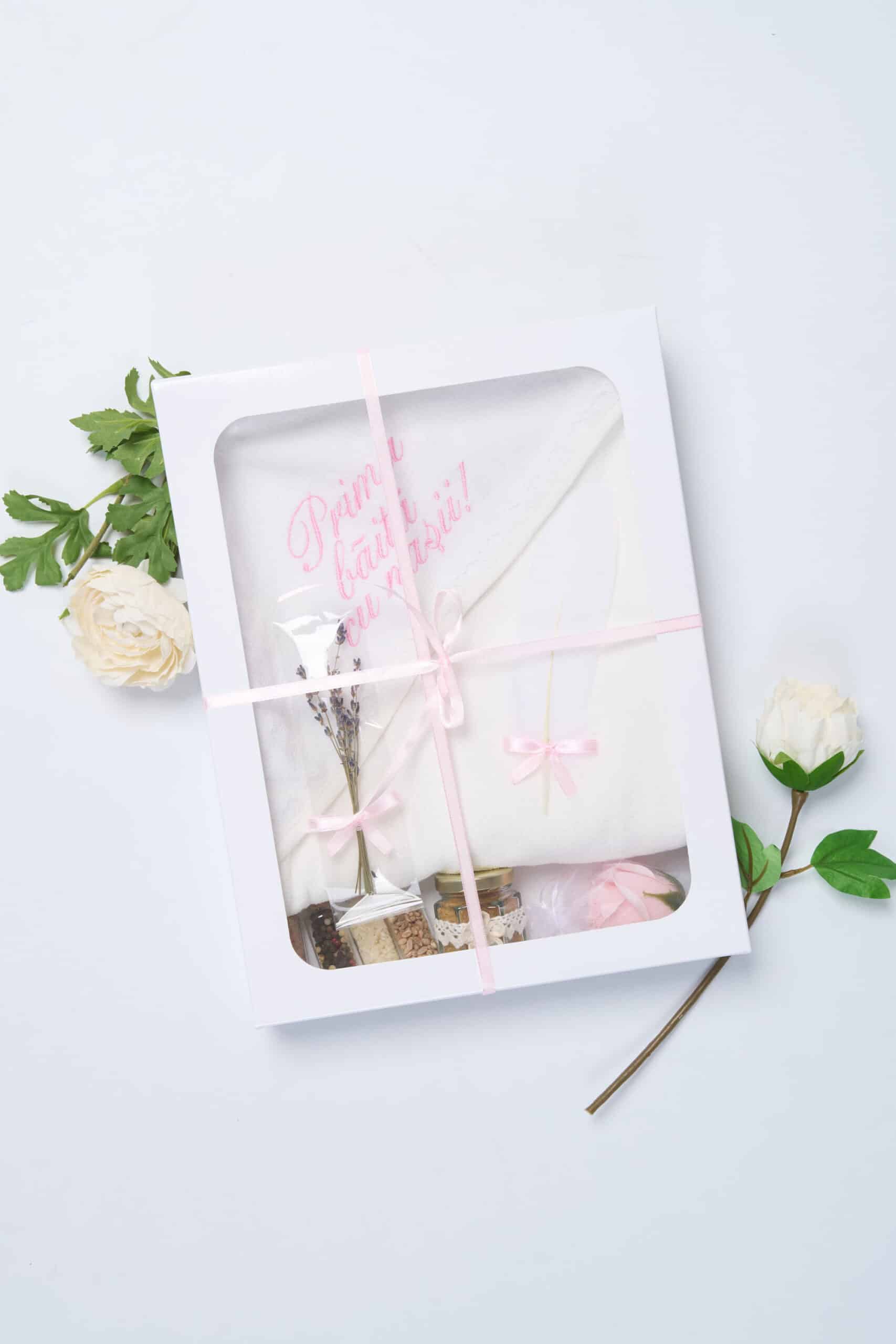 Setul „Prima băiță cu nașii” este creat pentru a transforma acest ritual într-o amintire plăcută, așezat cu grijă într-o cutie elegantă cu fereastră, legată cu fundiță fină, pregătită să fie oferită cadou.