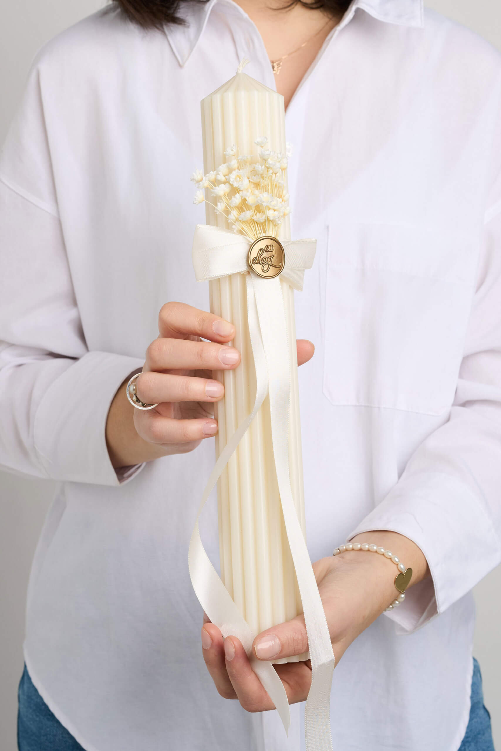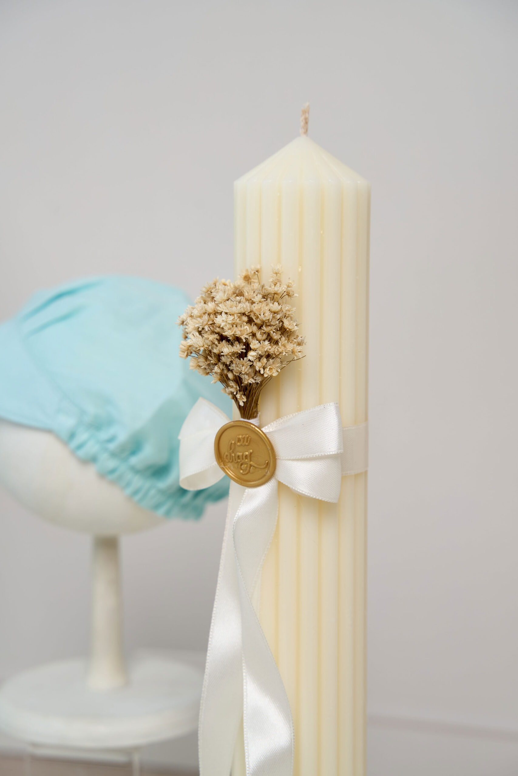🕯️ Lumânare de botez – lumânare de botez creată cu grijă și gânduri bune, decorată cu flori uscate și legată cu o panglică fină, pecetluită cu Sigiliul Dragostei
