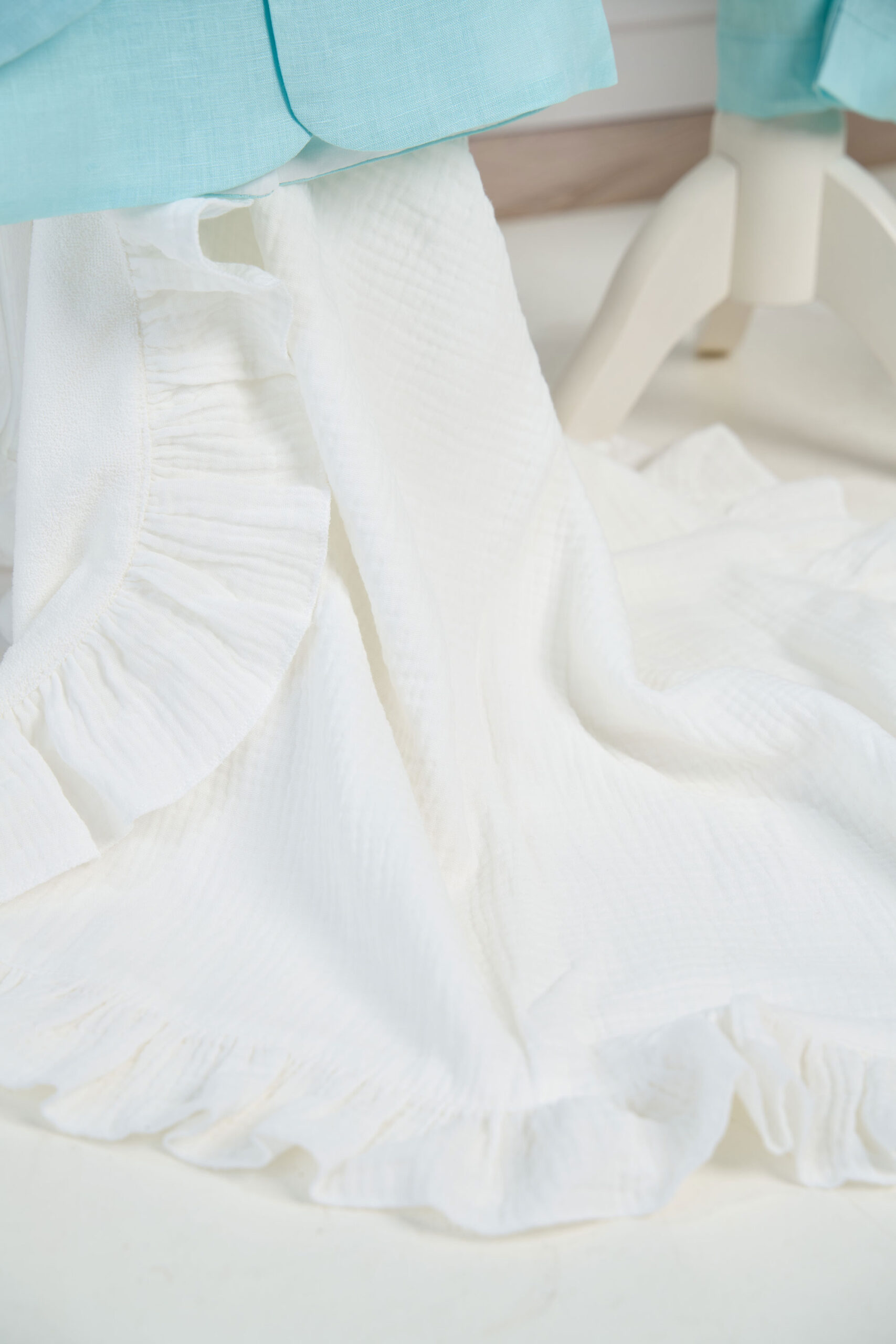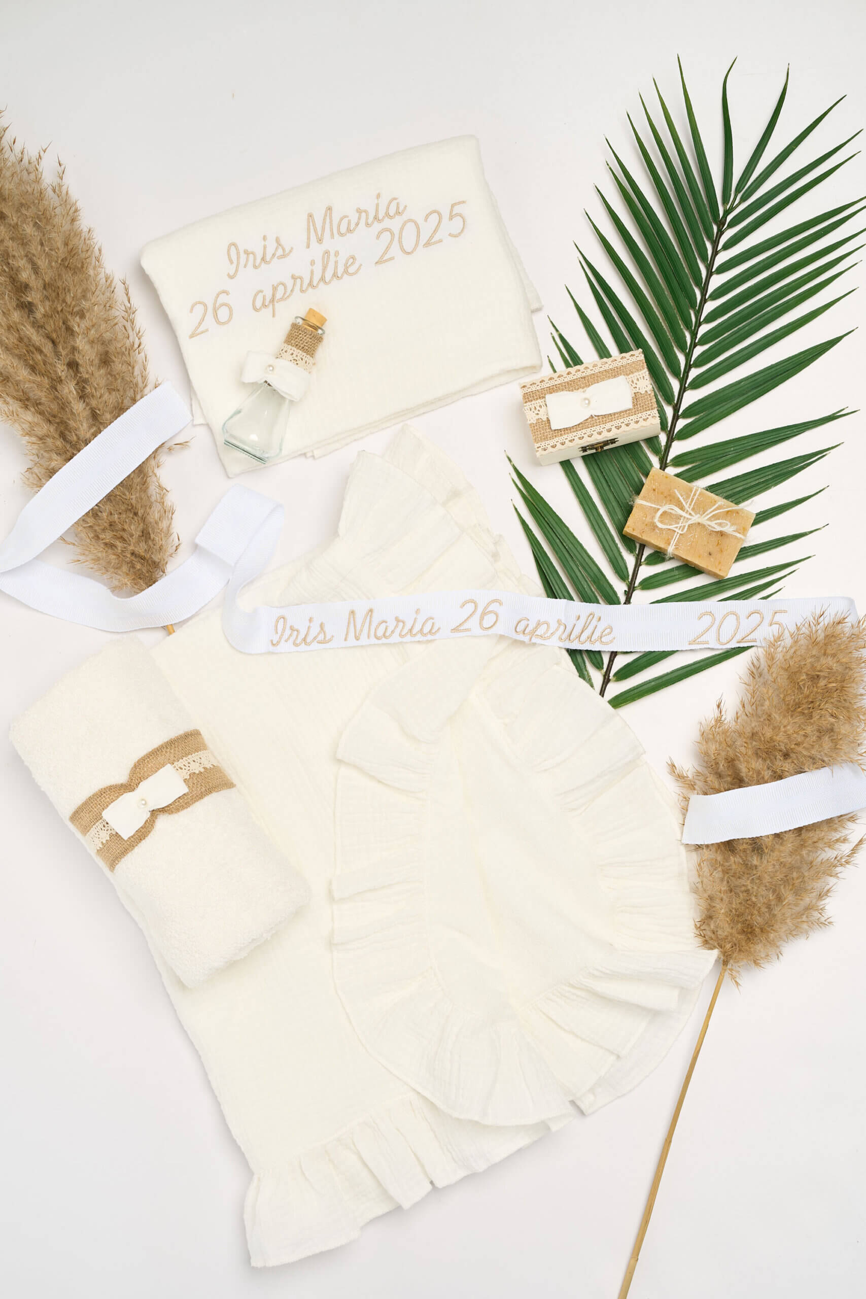 🕊️ Trusou de botez 7 piese –Setul conține pânza de mir cu capișon (125×75 cm), prosop decorat pentru preot (50×90 cm), pled din muselină cu interior tip prosop și capișon brodat (82×82 cm), săpun decorat, sticluță de mir asortată, fașă de 160 cm și cutiuță pentru prima șuviță.