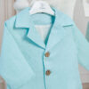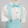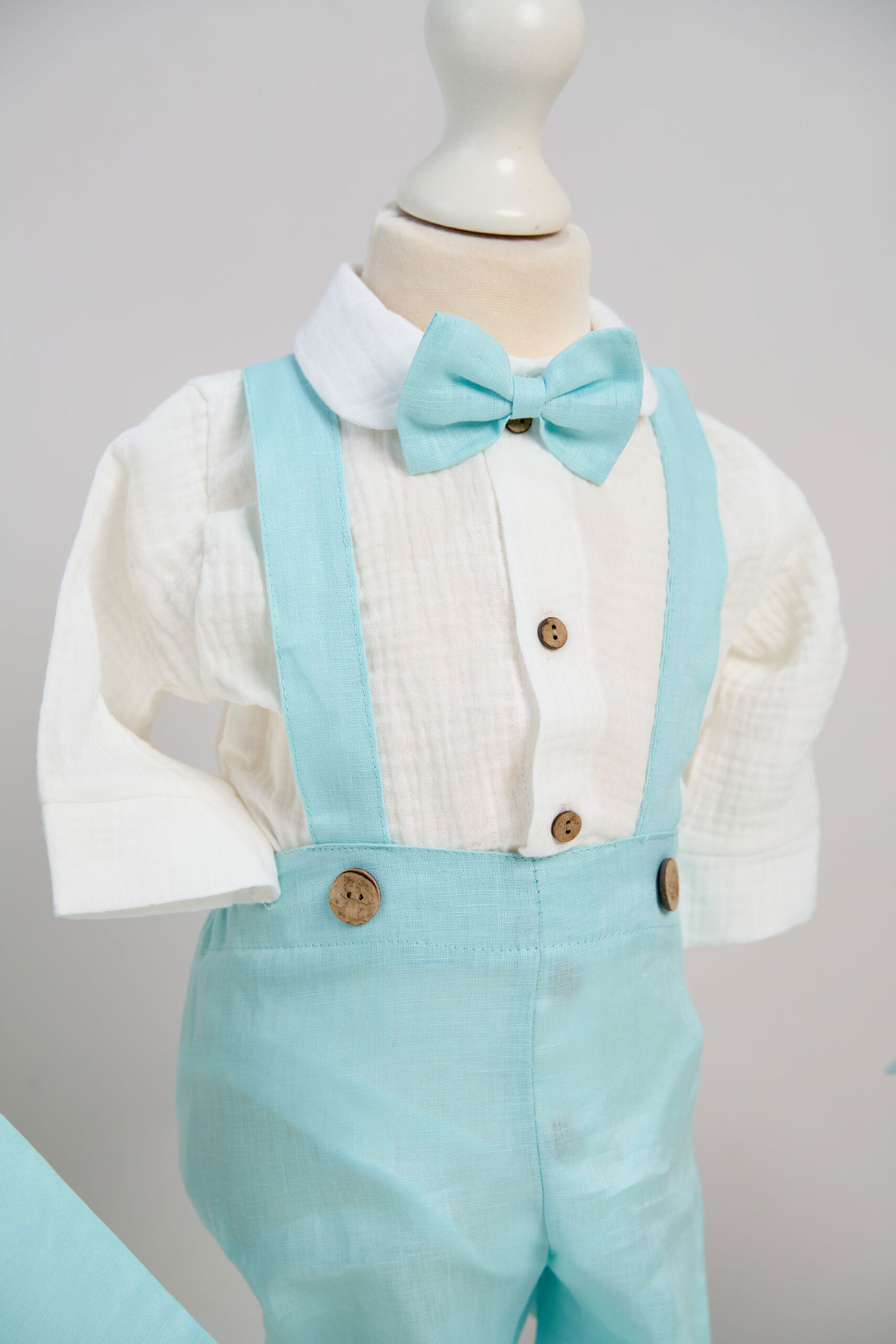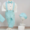 – Costum Dan – 5 piese: Cămașă tip body din muselină, Pantaloni din in cu bretele detașabile, Sacou din in, Papion din in, Șapcă din in cu elastic reglabil.