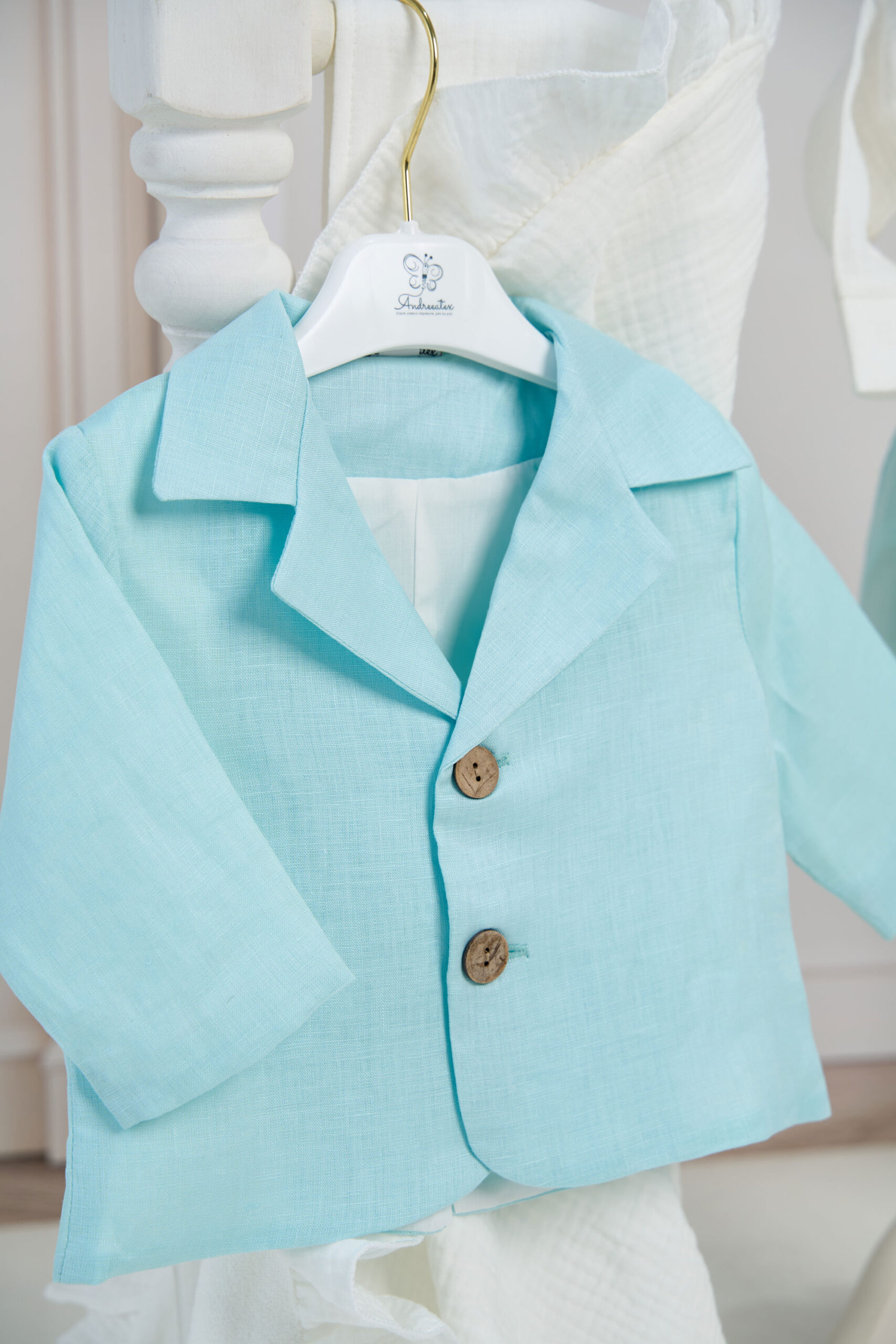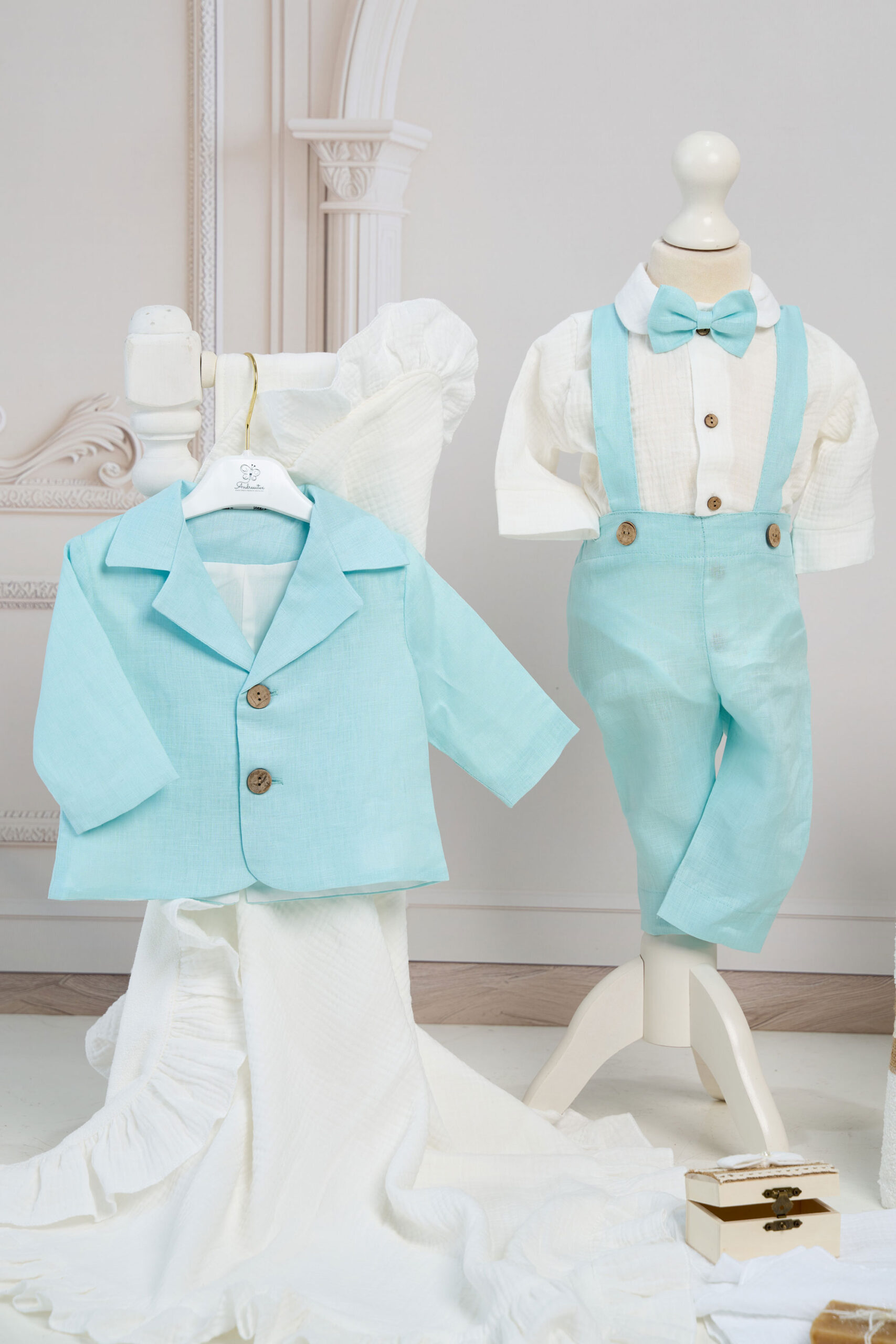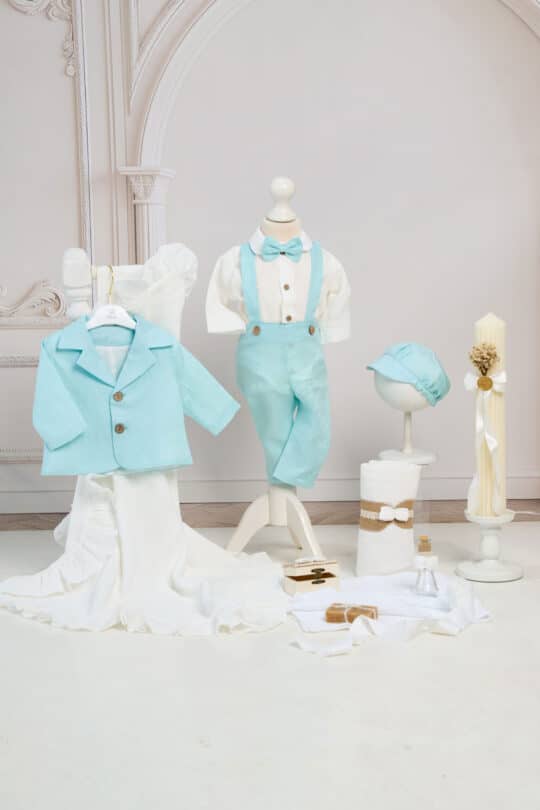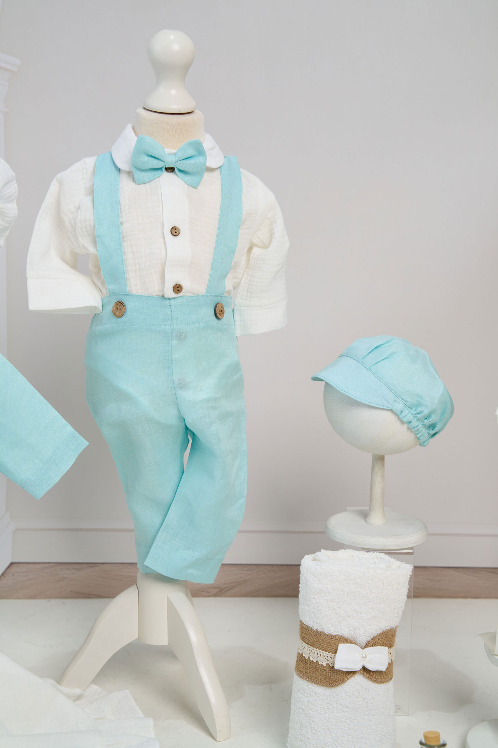 ✂︎ Costum botez băieți -Set compus din 5 piese: Cămașă tip body din muselină, Pantaloni din in cu bretele detașabile, Sacou din in, Papion din in, Șapcă din in cu elastic reglabil.