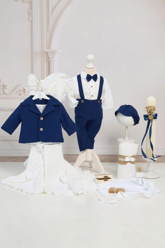 ✂︎ Costum botez băieți -Set compus din 5 piese: Cămașă tip body din muselină, Pantaloni din in cu bretele detașabile, Sacou din in, Papion din in, Șapcă din in cu elastic reglabil.