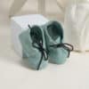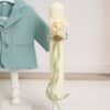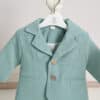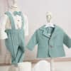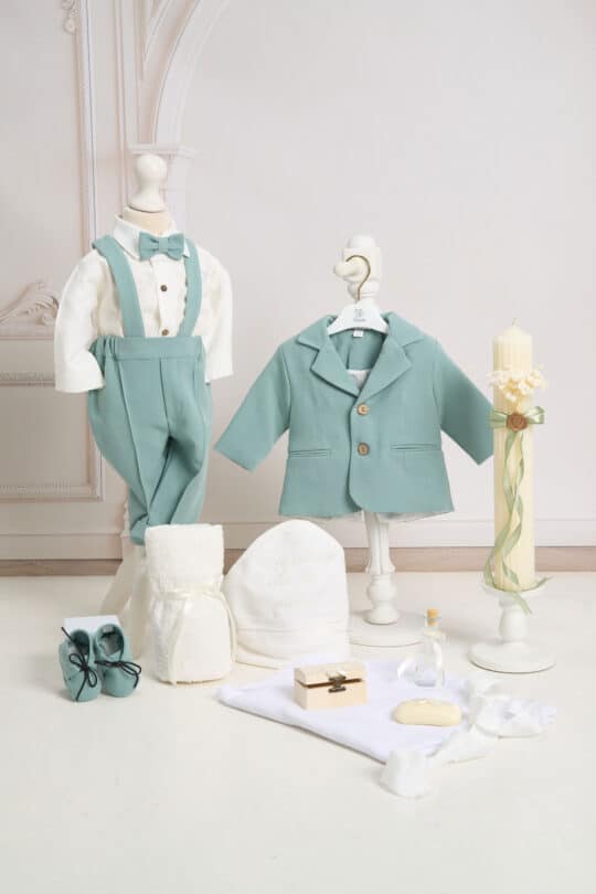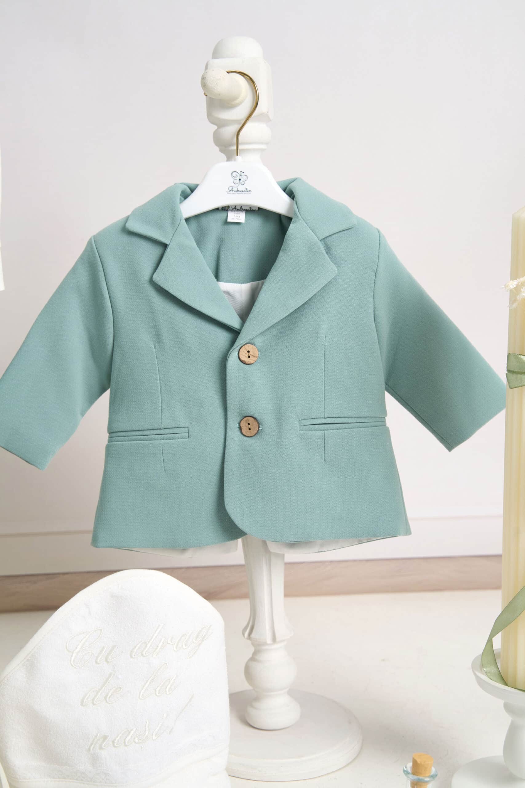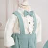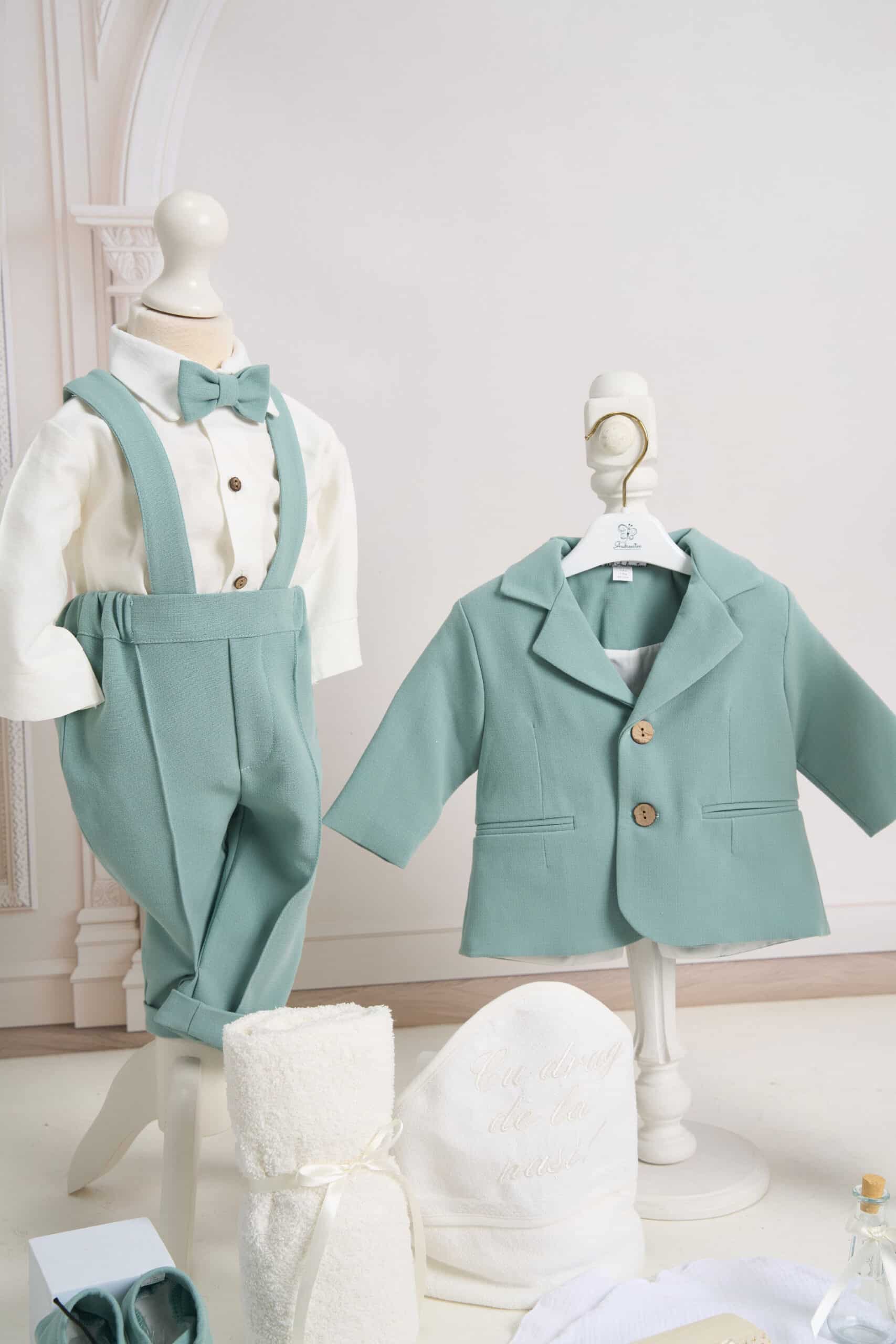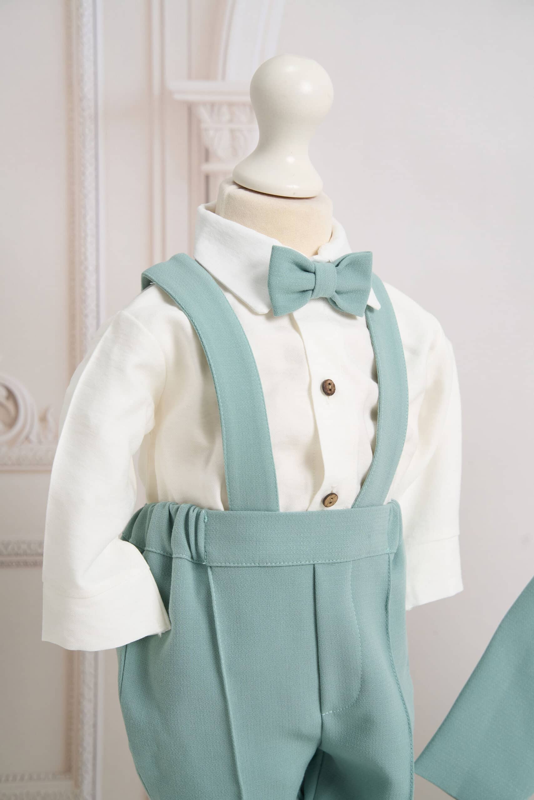 Ținuta include un costum mentă din stofă fină, în stil clasic, compus din cămașă tip boy, alb-ivoire cu papion asortat, pantaloni cu bretele și sacou elegant cu nasturi decorativi. Setul este completat de botoșei asortați, realizați din material moale, pentru un plus de confort și stil.