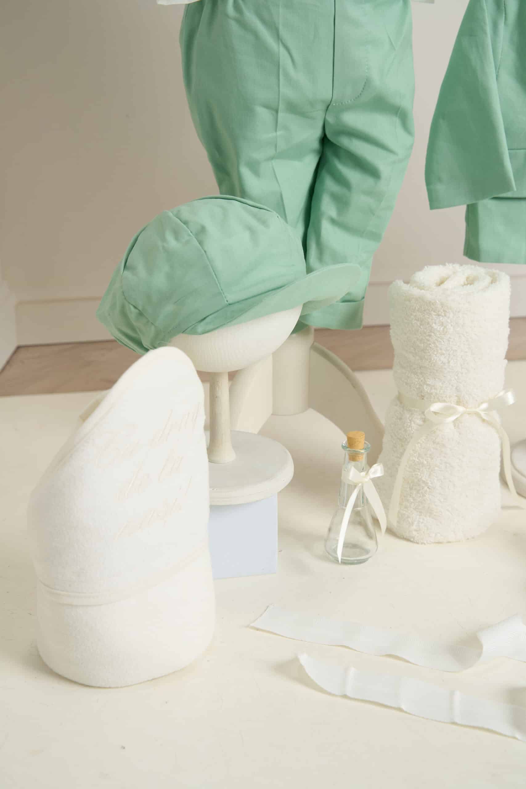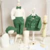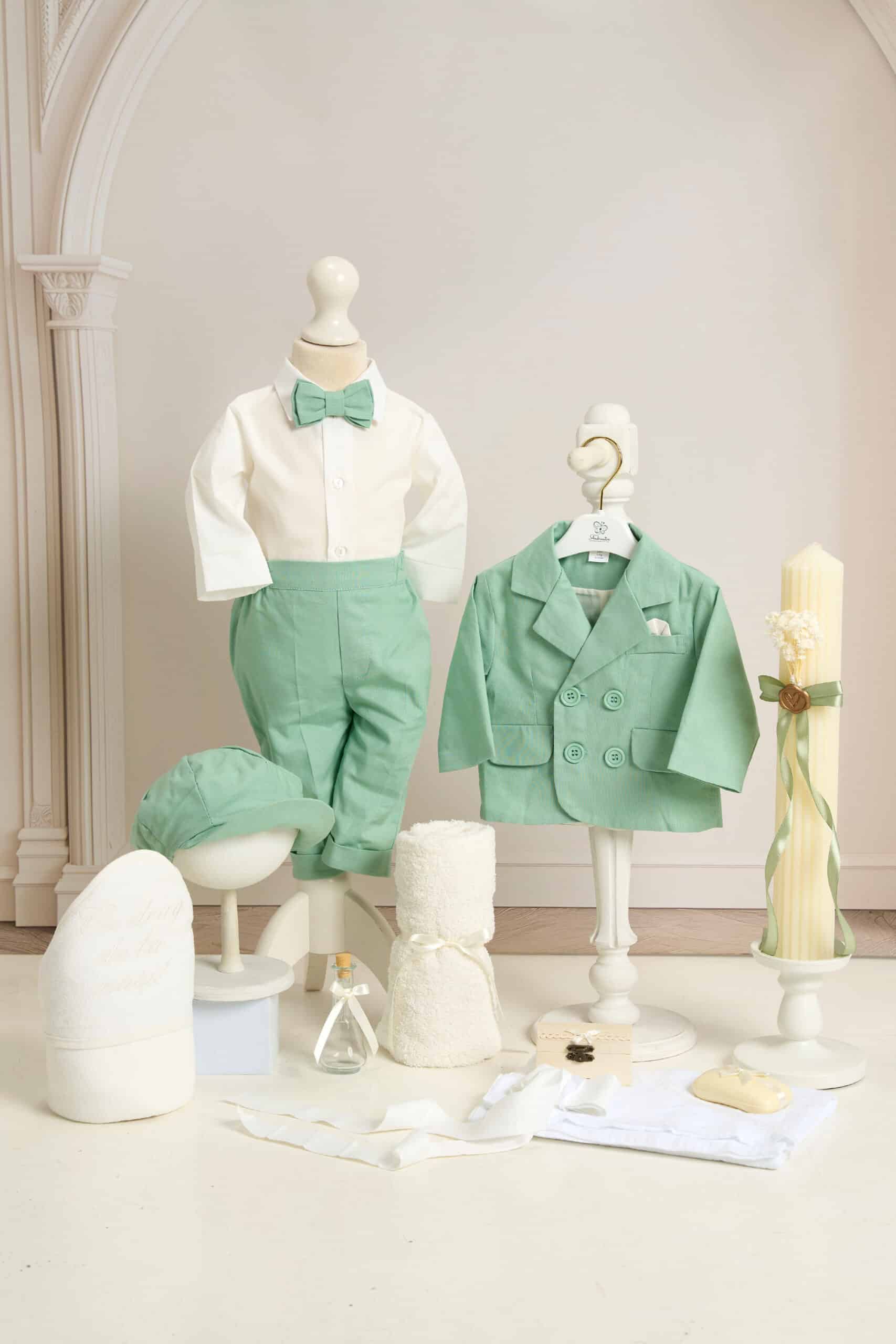 Ținuta include un costum mentă din stofă fină, în stil clasic, compus din cămașă tip boy, alb-ivoire cu papion asortat, pantaloni cu bretele și sacou elegant cu nasturi decorativi. Setul este completat de botoșei asortați, realizați din material moale, pentru un plus de confort și stil.