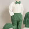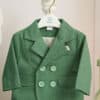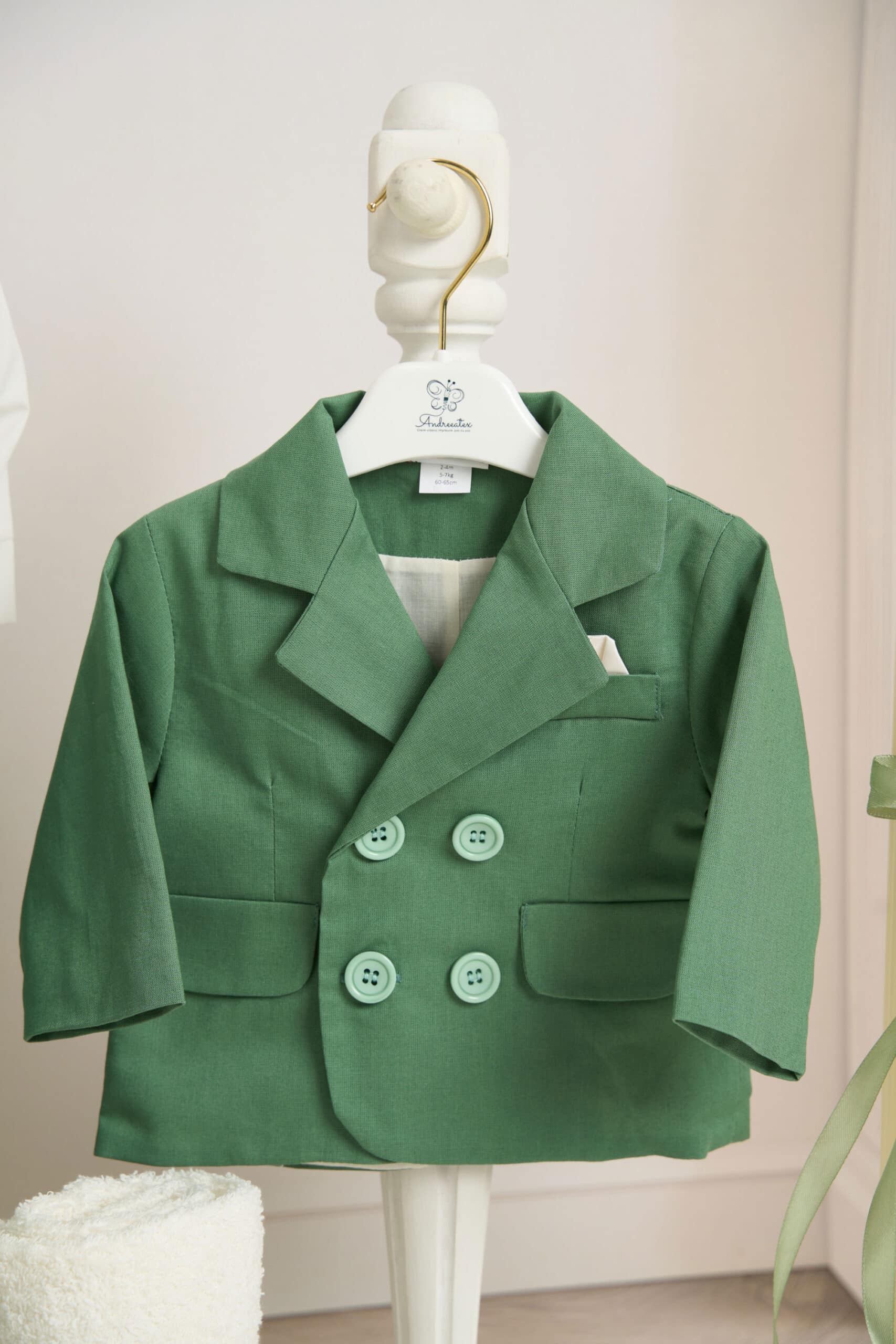 Ținuta include un costum mentă din stofă fină, în stil clasic, compus din cămașă tip boy, alb-ivoire cu papion asortat, pantaloni cu bretele și sacou elegant cu nasturi decorativi. Setul este completat de botoșei asortați, realizați din material moale, pentru un plus de confort și stil.