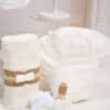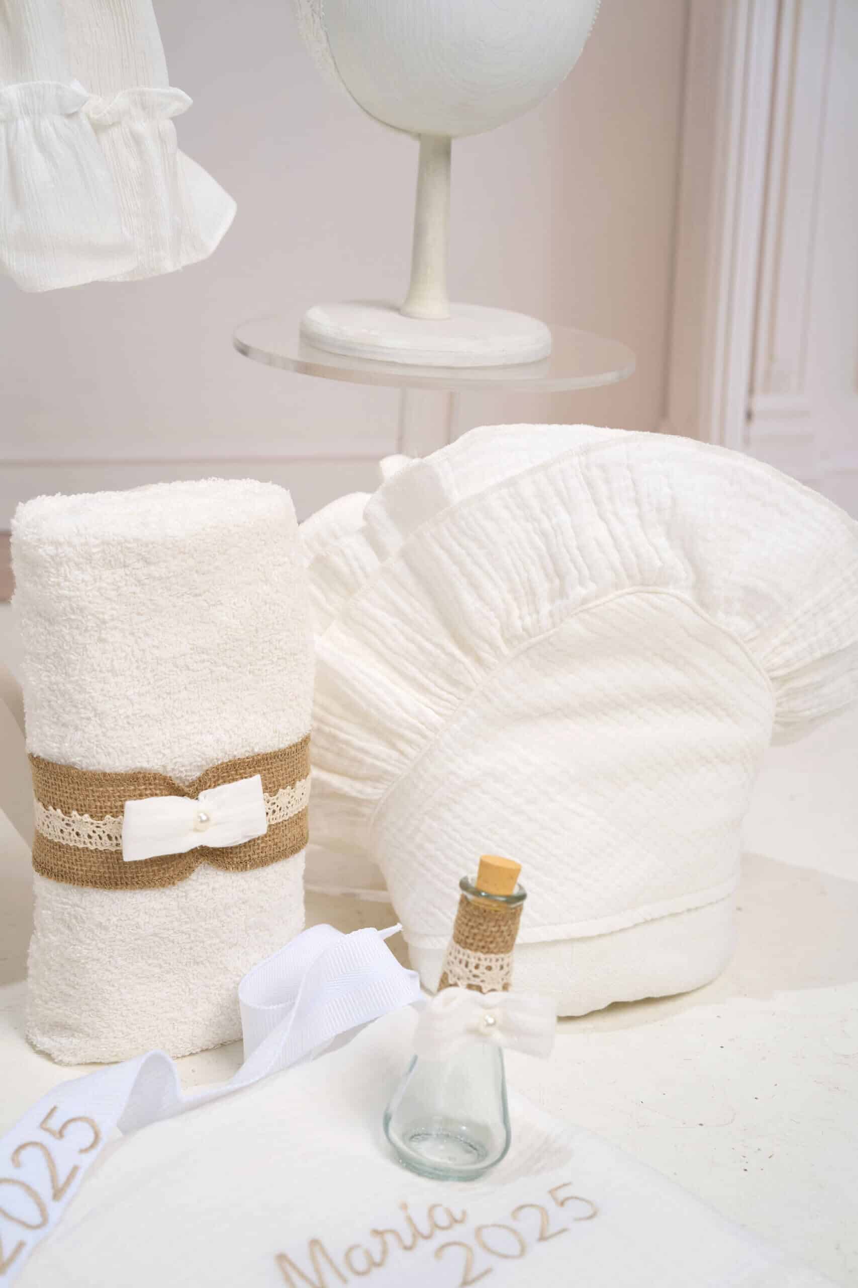 🕊️ Trusou de botez 7 piese – Tot ce ai nevoie într-un singur loc! Prosop cu capișon bebeluș, prosop preot, pânză de mir cu capișon, fașă, săpun, sticluță mir decorată, cutiuță pentru prima șuviță