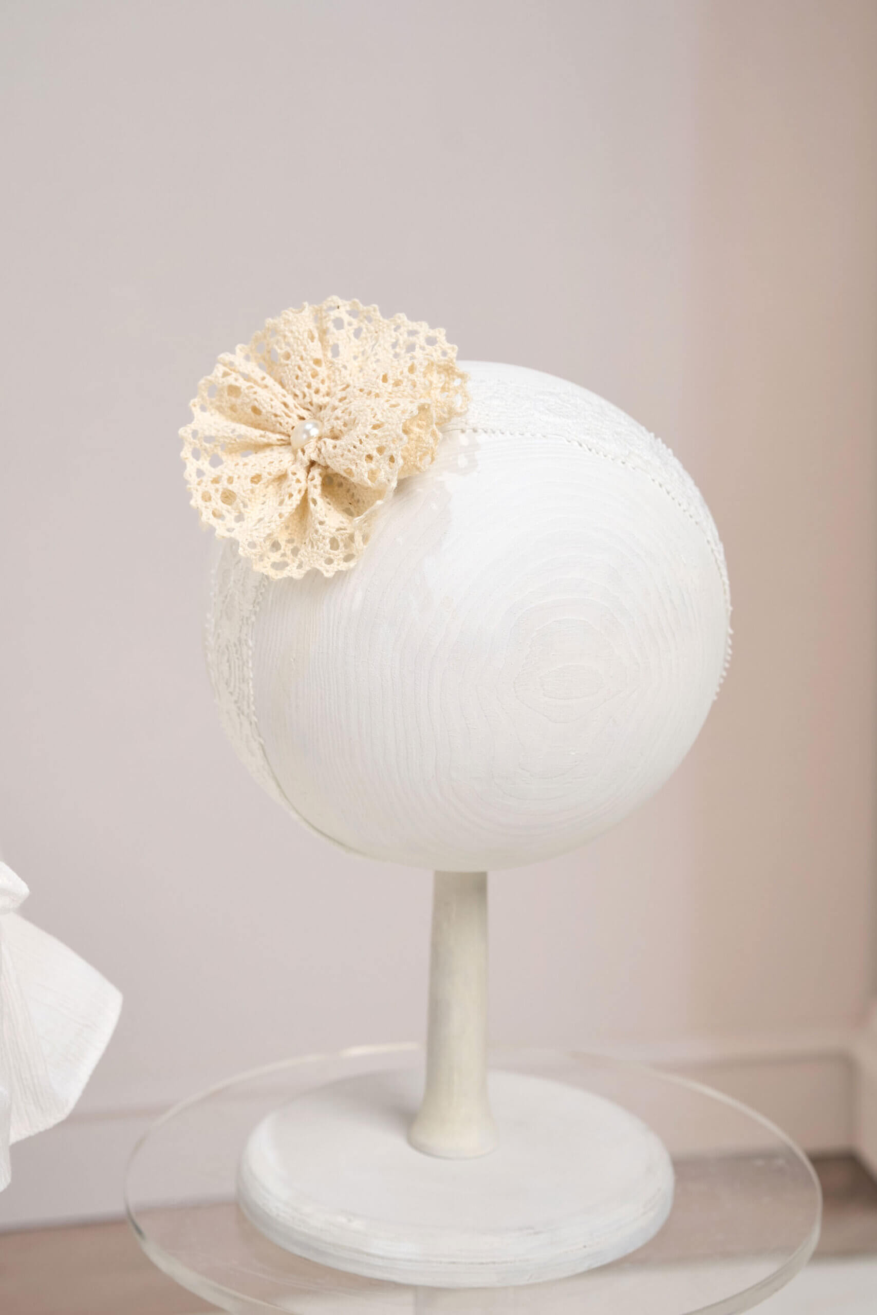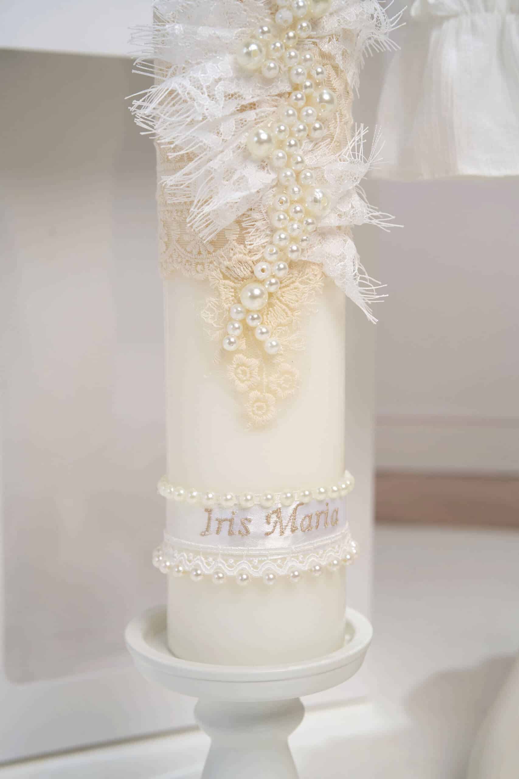 🕯️ Lumânare de botez – Creată în nuanțe delicate de ivoire, decorată cu dantelă fină, perle elegante și elemente de inspirație vintage.