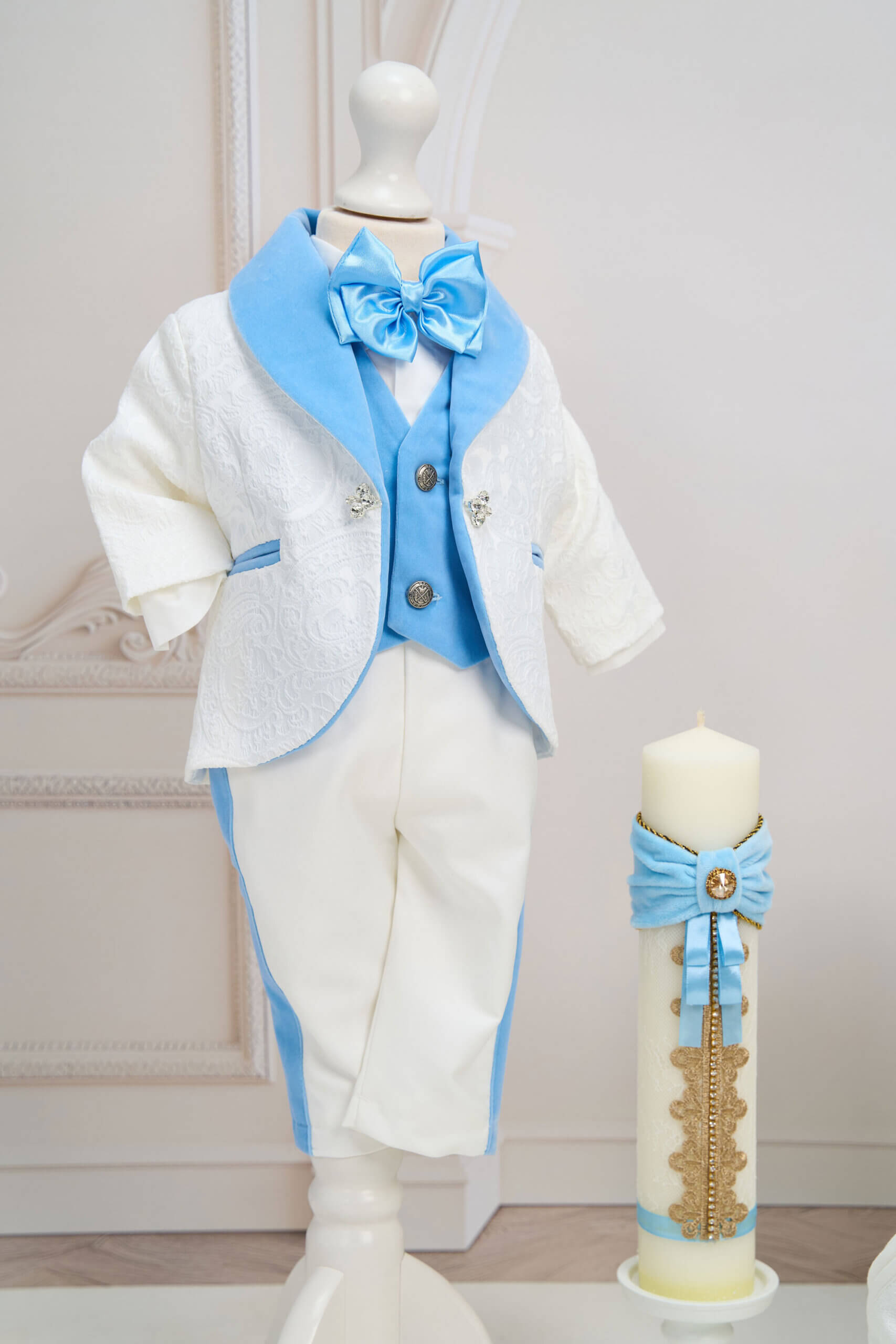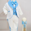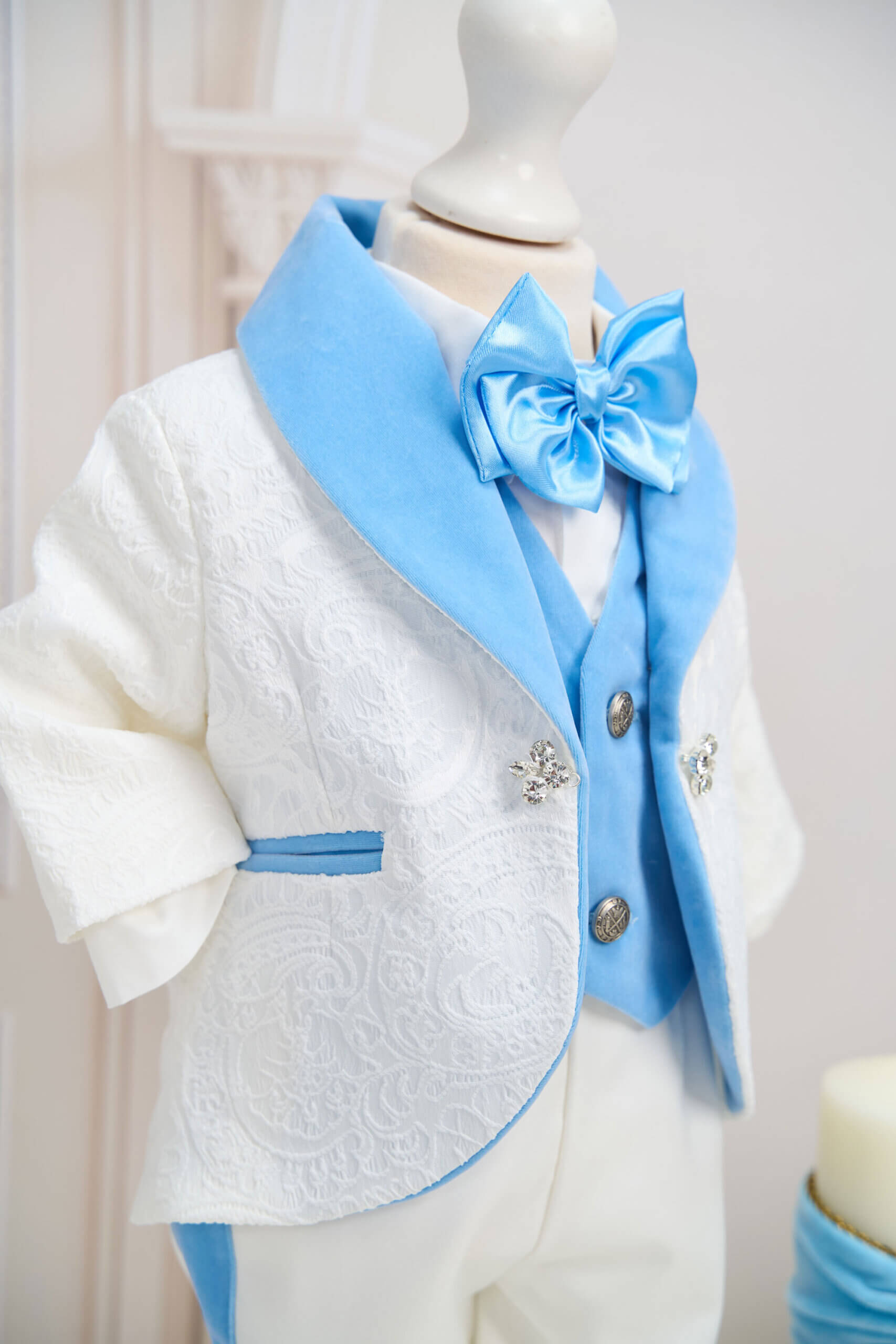 ✂︎ Costum botez băieți – Sacoul din brocart cu model delicat este completat de o vestă din catifea, guler șal și vipușcă pe pantaloni, toate din catifea.
