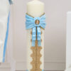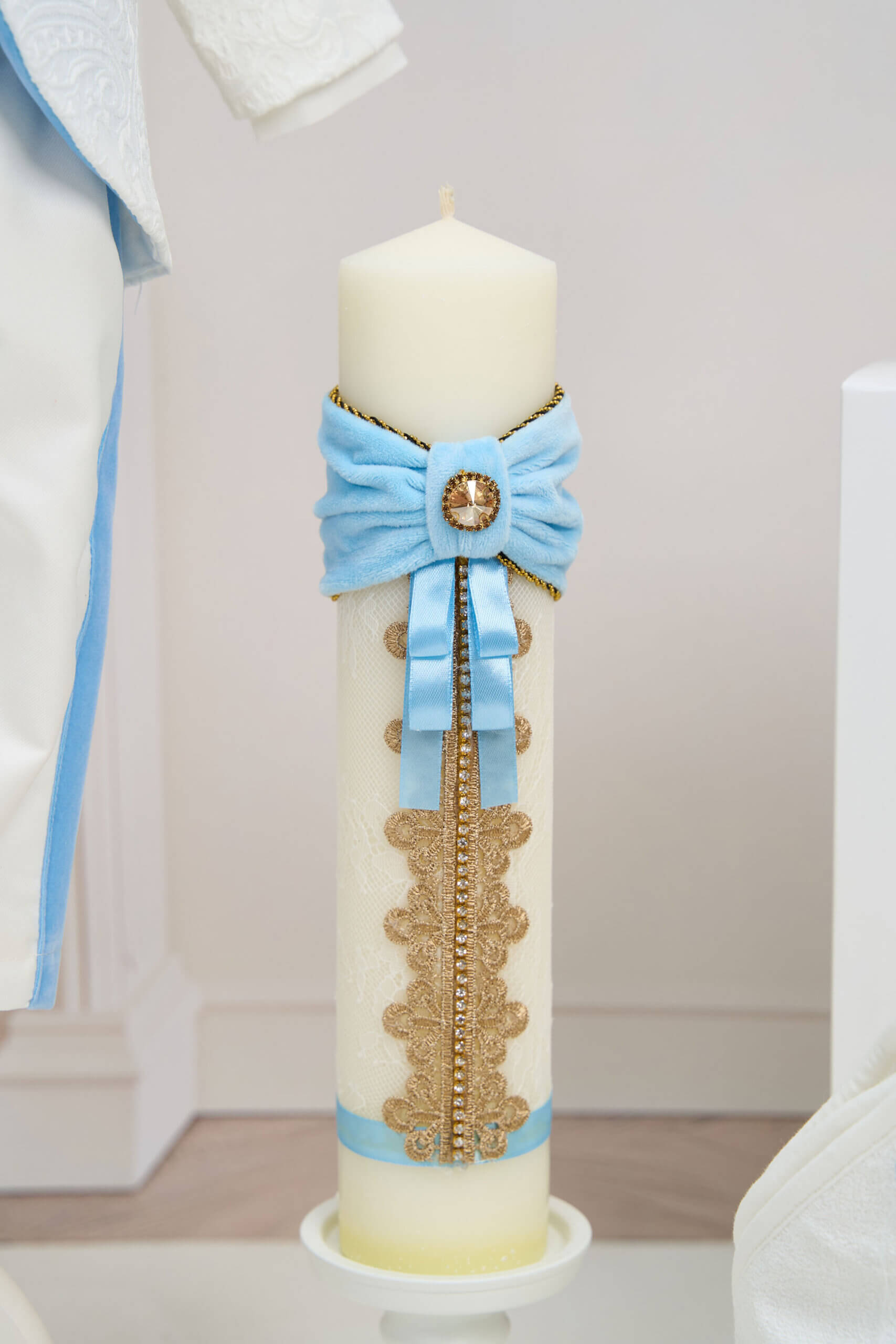 🕯️ Lumânare de botez – Lumânarea de botez are accente de catifea albastru, broderie aurie și panglici de satin și detalii strălucitoare, elementele îi aduc un plus de contrast și rafinament.