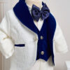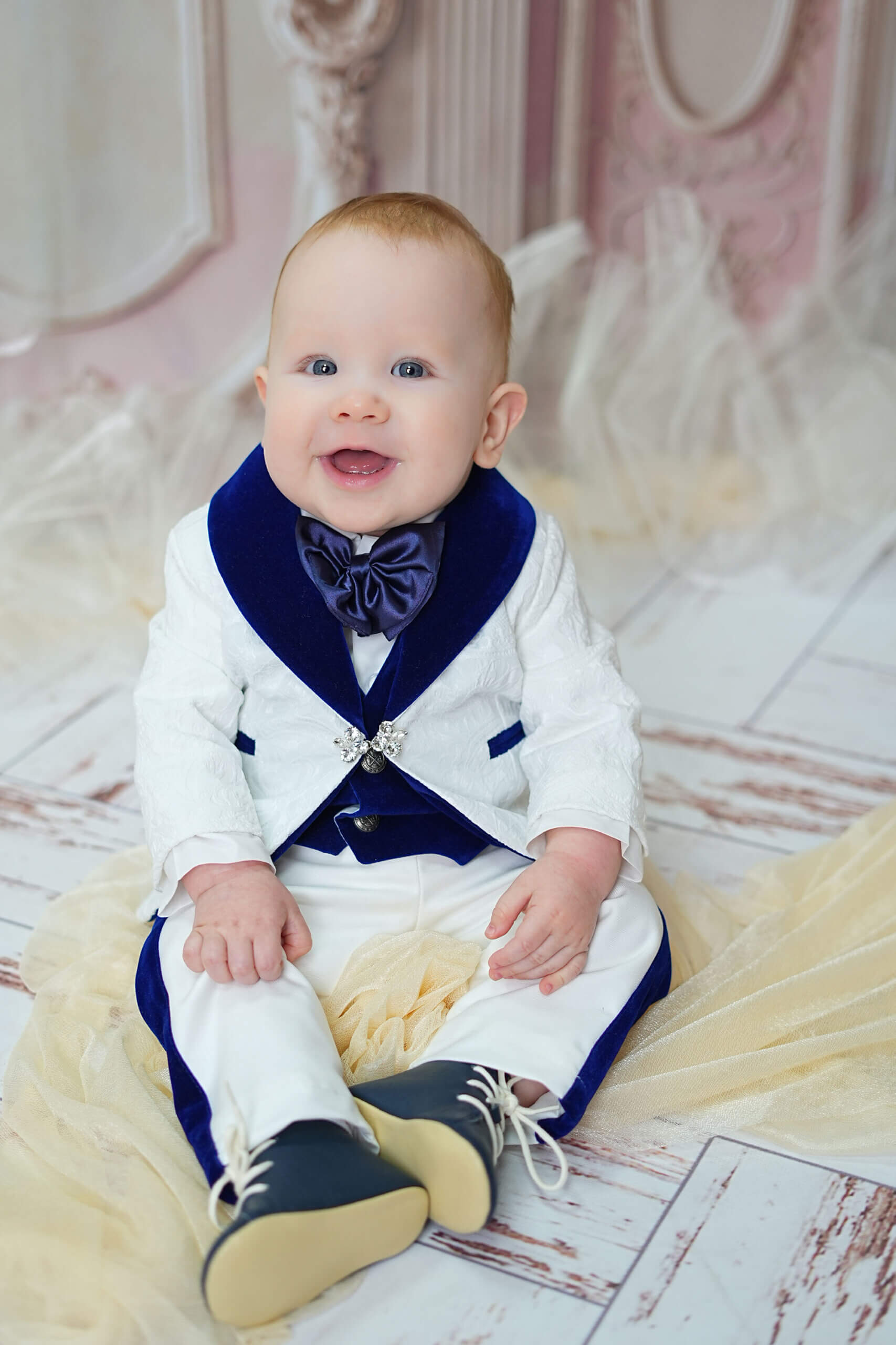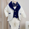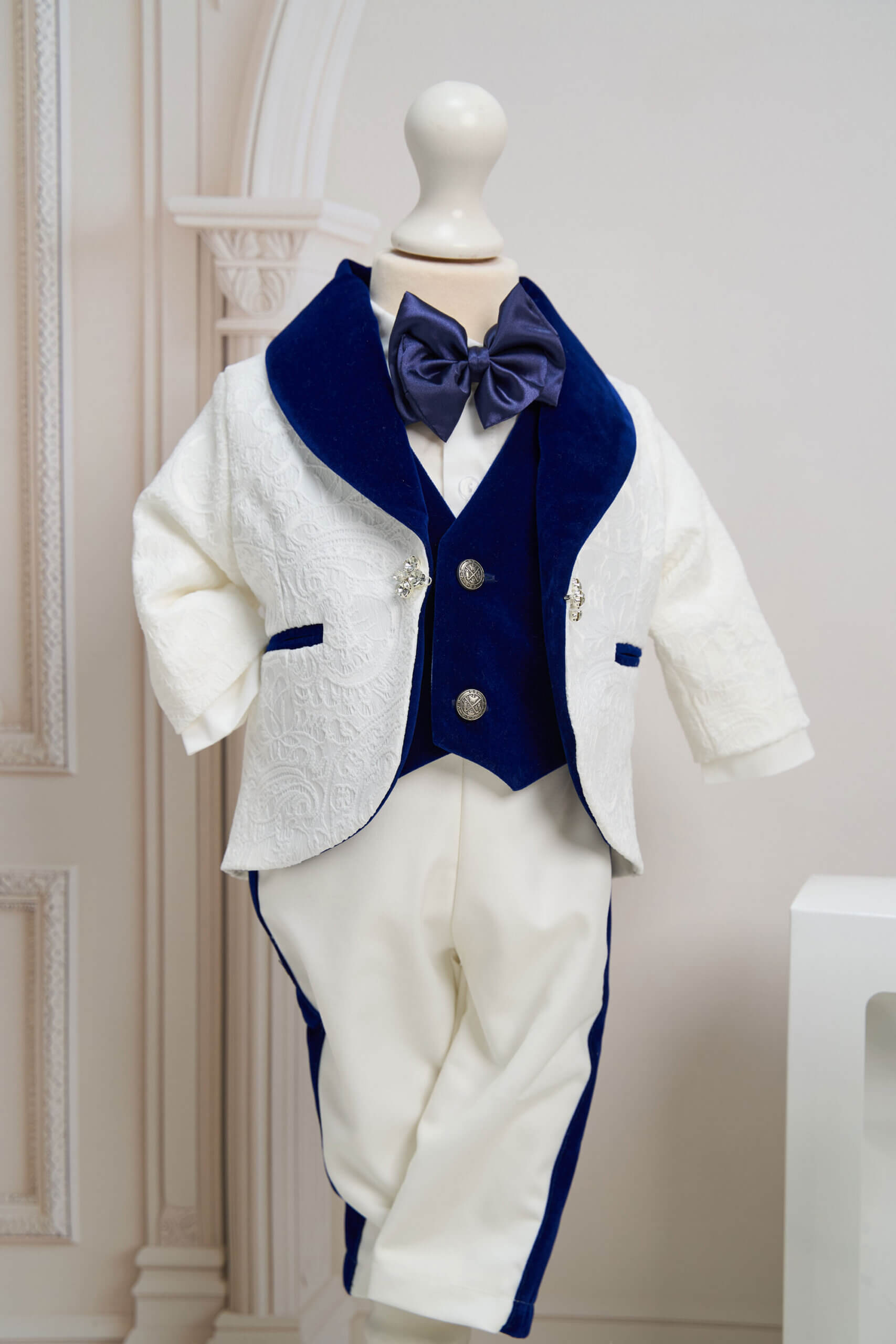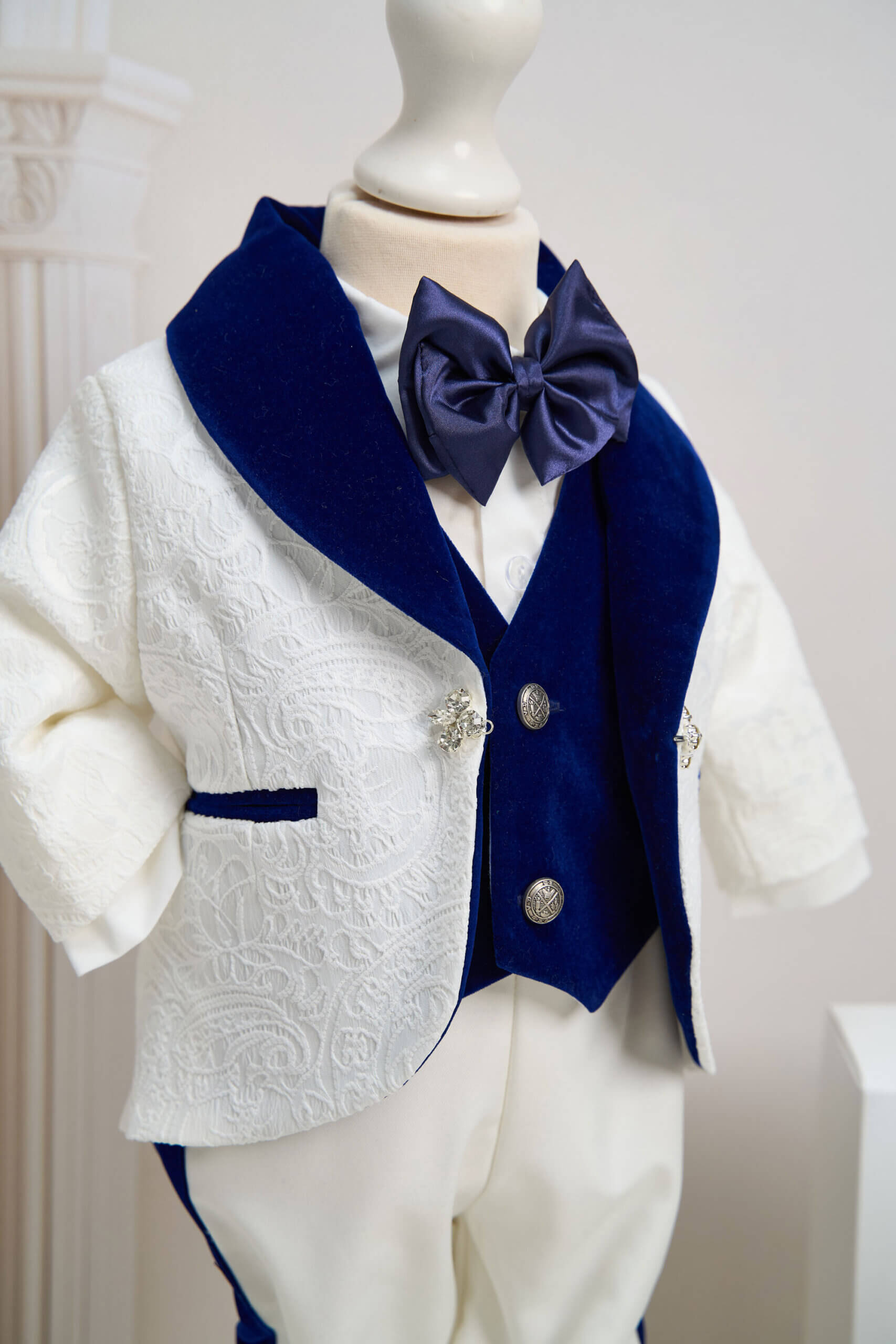 ✂︎ Costum botez băieți – Sacoul din brocart cu model delicat este completat de o vestă din catifea, guler șal și vipușcă pe pantaloni, toate din catifea.