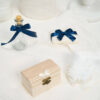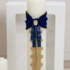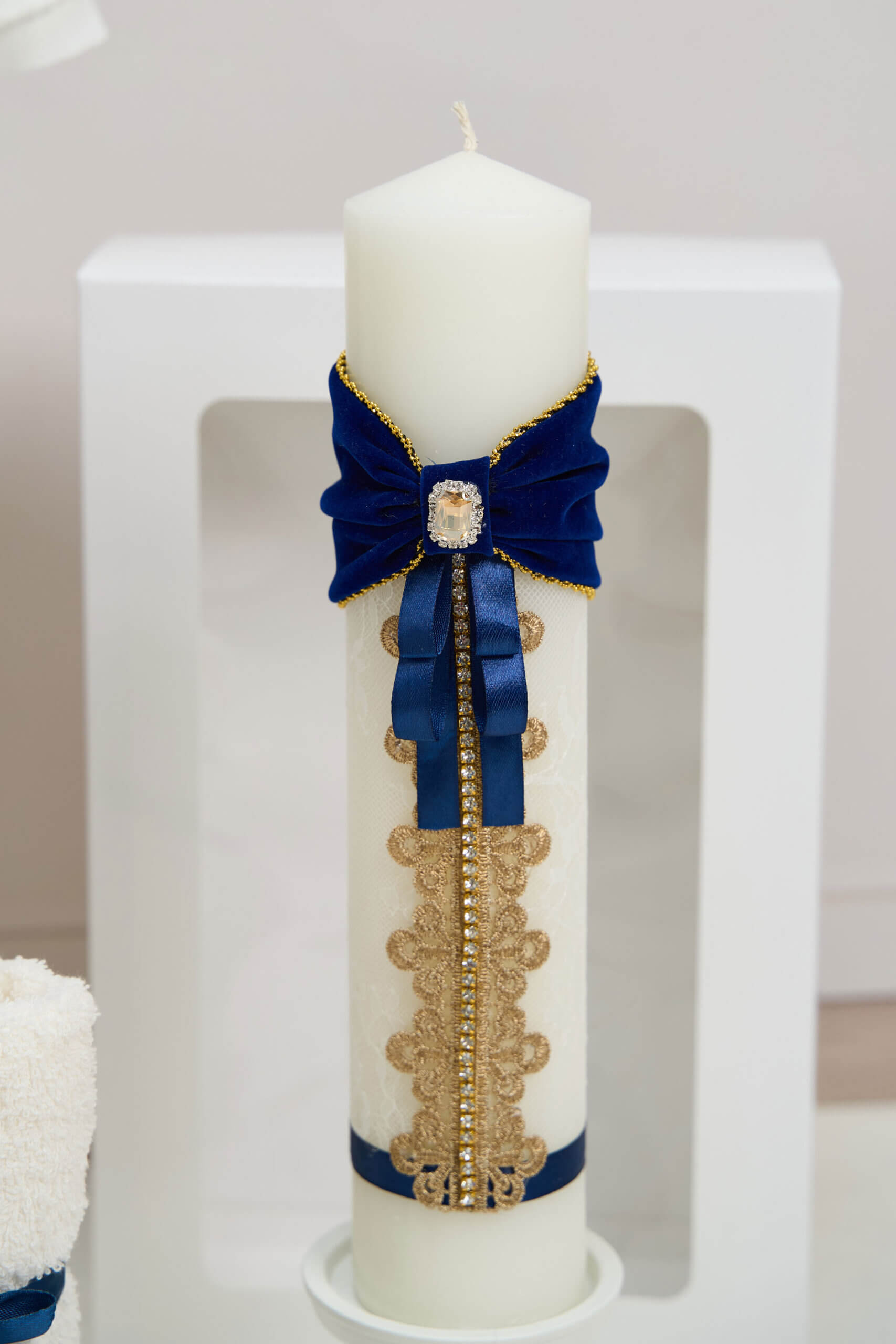 🕯️ Lumânare de botez – Lumânarea de botez are accente de catifea albastru, broderie aurie și panglici de satin și detalii strălucitoare, elementele îi aduc un plus de contrast și rafinament.