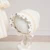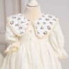 - Set Pavlova 3 piese – Rochiță din bumbac cu guler brodat manual și margine din dantelă fină; Bonetă asortată, cu volănașe și detalii brodate; Pantofiori din material textil, cu fundițe și detalii decorative.