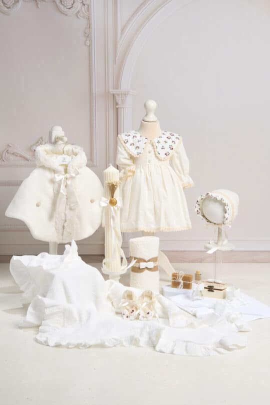 Set esențial botez Pavlova + Capă + Trusou + Lumânare – ivoire