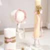 Lumânare de botez – Lumânarea de botez este decorată cu floricele uscate, fundă din satin roz și sigiliu elegant auriu, pentru un stil delicat, modern și natural.