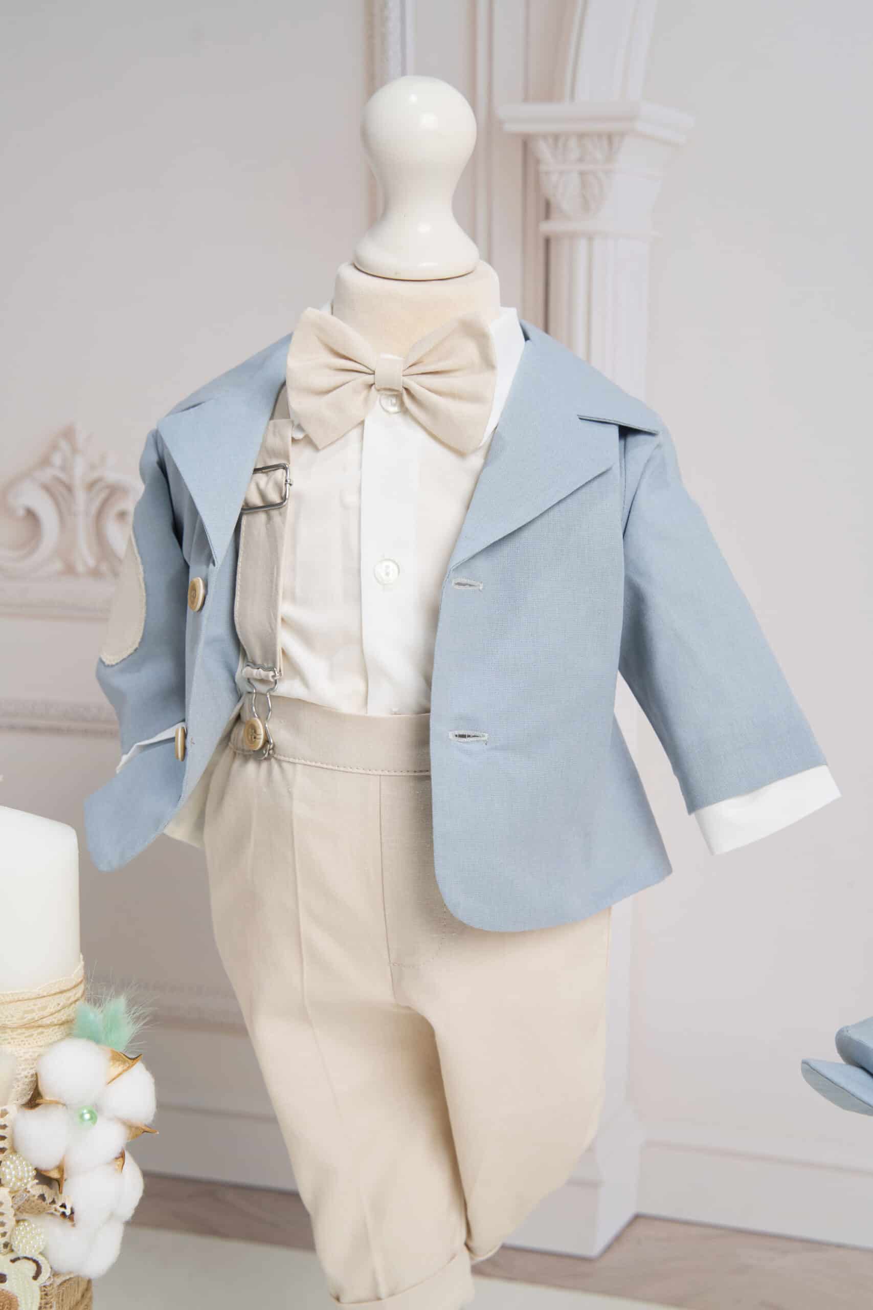 Costum botez băieți – Sacou Gri cu Croială Clasică, Cămașă din Bumbac, Pantaloni Eleganți, Papion și Bretele Ivoire, Șapcă Asortată
