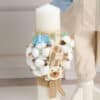 Lumânare de botez –Lumânare conceptuală, unicat, realizată manual în serii mici, cu un design elegant ce îmbină rafia rustică, dantela delicată, perlele fine, florile nemuritoare și un ursuleț adorabil, aducând rafinament și tandrețe oricărui moment special, precum botezul.