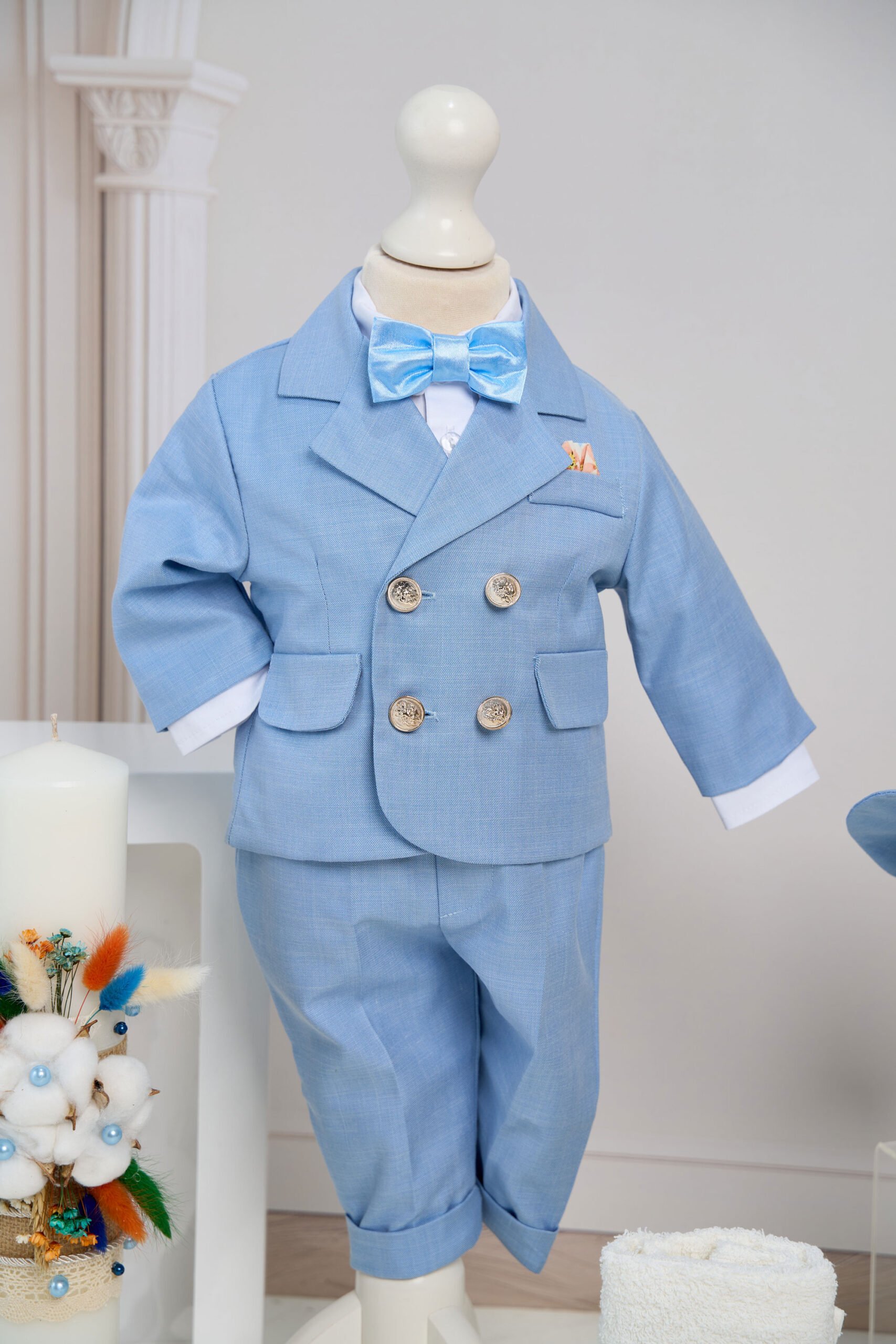 ✂︎ Costum botez băieți – Costumul conține 5 piese: pantaloni, sacou, cămașă , pălăriuță, papion.