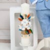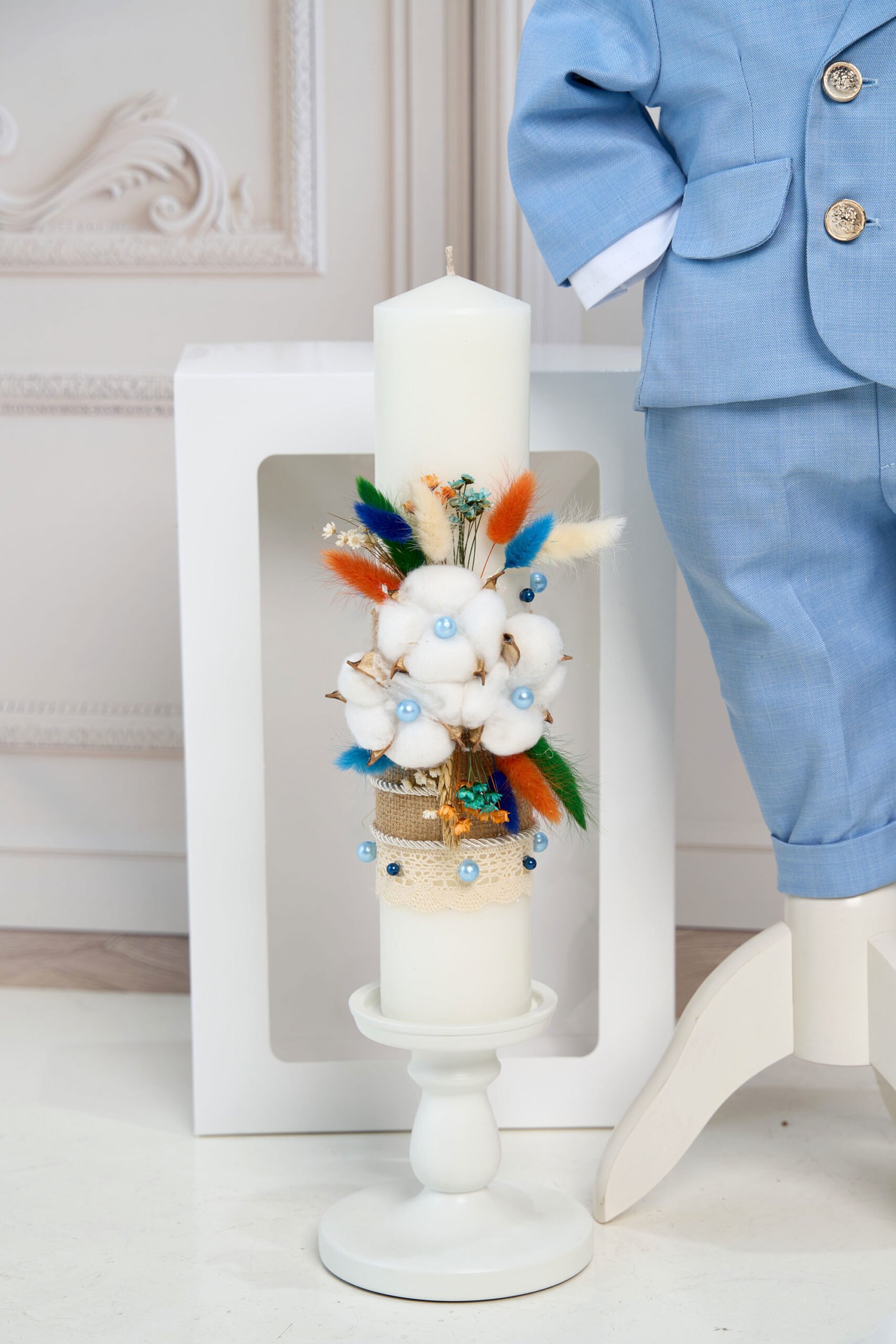 🕯️ Lumânare de botez – Decorată cu panglici viu colorate și elemente naturale ca flori de bumbac, dantelă și panglici, aduce un plus de prospețime ceremoniei de botez.