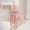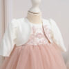 🎀 Set 4 piese – Rochie realizată din tafta ivoire delicată, cu detalii fine de dantelă pe partea superioară și o fustă din tulle vaporoasă. Bolero cu croi simplu și elegant, completată cu o fundiță din panglică satinată și detalii aplicate din dantelă.Pampon cu floare din tulle și gogoșari din satin.