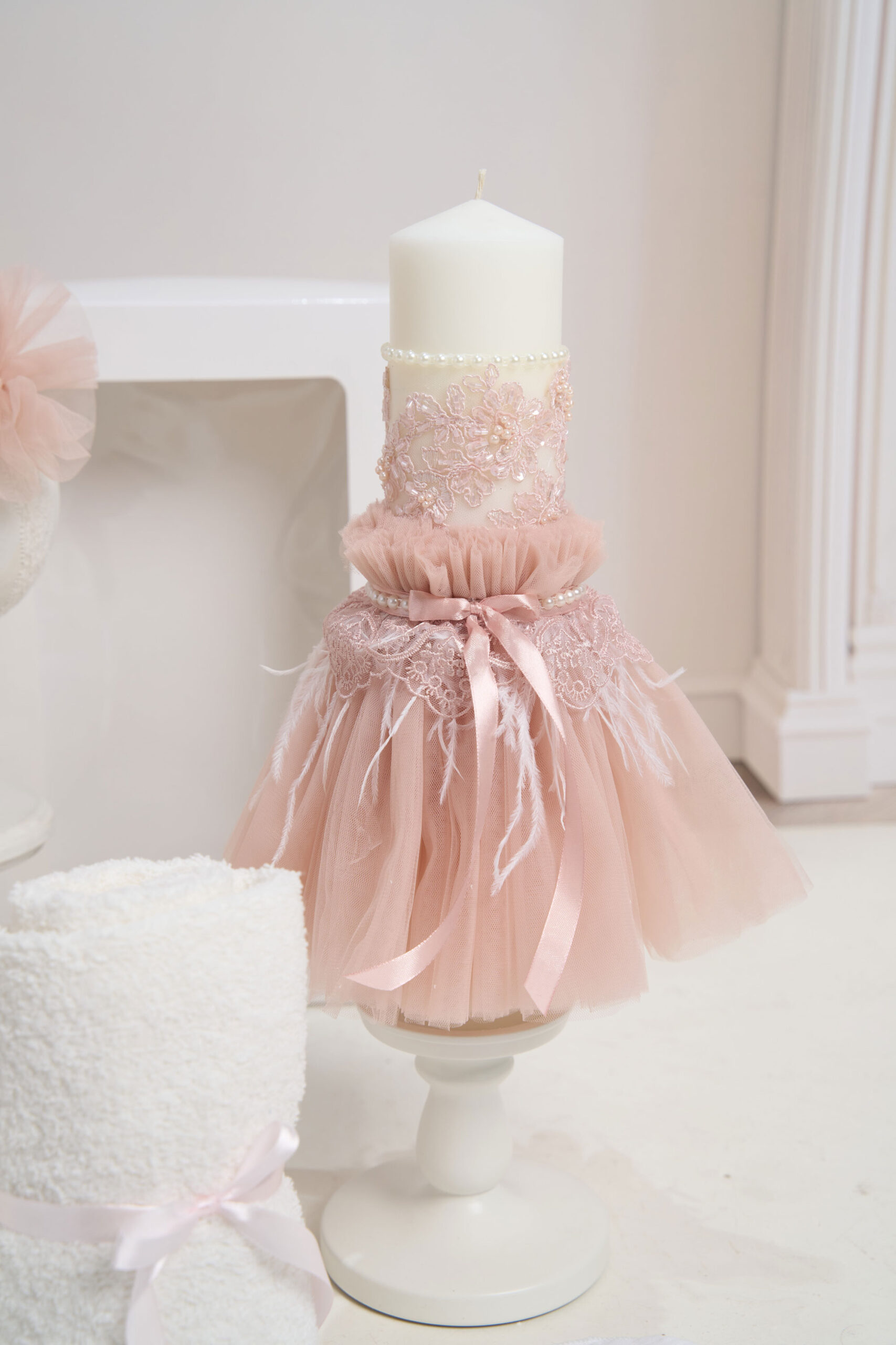 🕯️ Lumânare de botez –Lumânare de botez, cu tull, dantelă, pene și mărgele, elegantă și de efect.