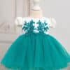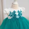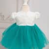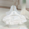 🎀 Set 4 piese – Rochie realizată din tafta ivoire delicată, cu detalii fine de dantelă pe partea superioară și o fustă din tulle vaporoasă. Bolero cu croi simplu și elegant, completată cu o fundiță din panglică satinată și detalii aplicate din dantelă.Pampon cu floare din tulle și gogoșari din satin.