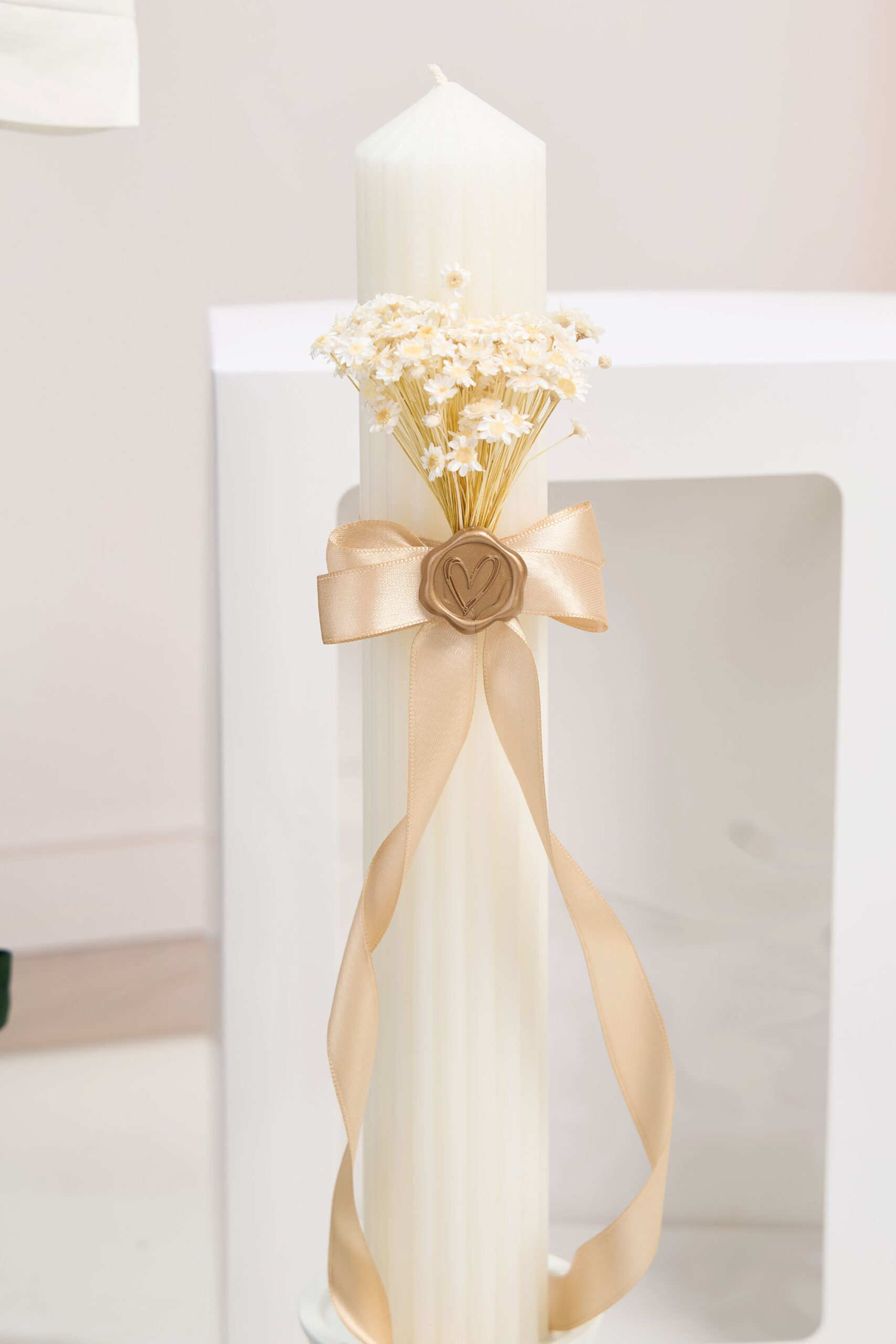 🕯️ Lumânare de botez –Lumânare de botez cu flori uscate albe, fundă satinată bej și sigiliu din ceară gravat – un detaliu elegant și discret pentru un botez cu aer clasic și rafinat