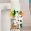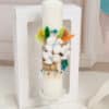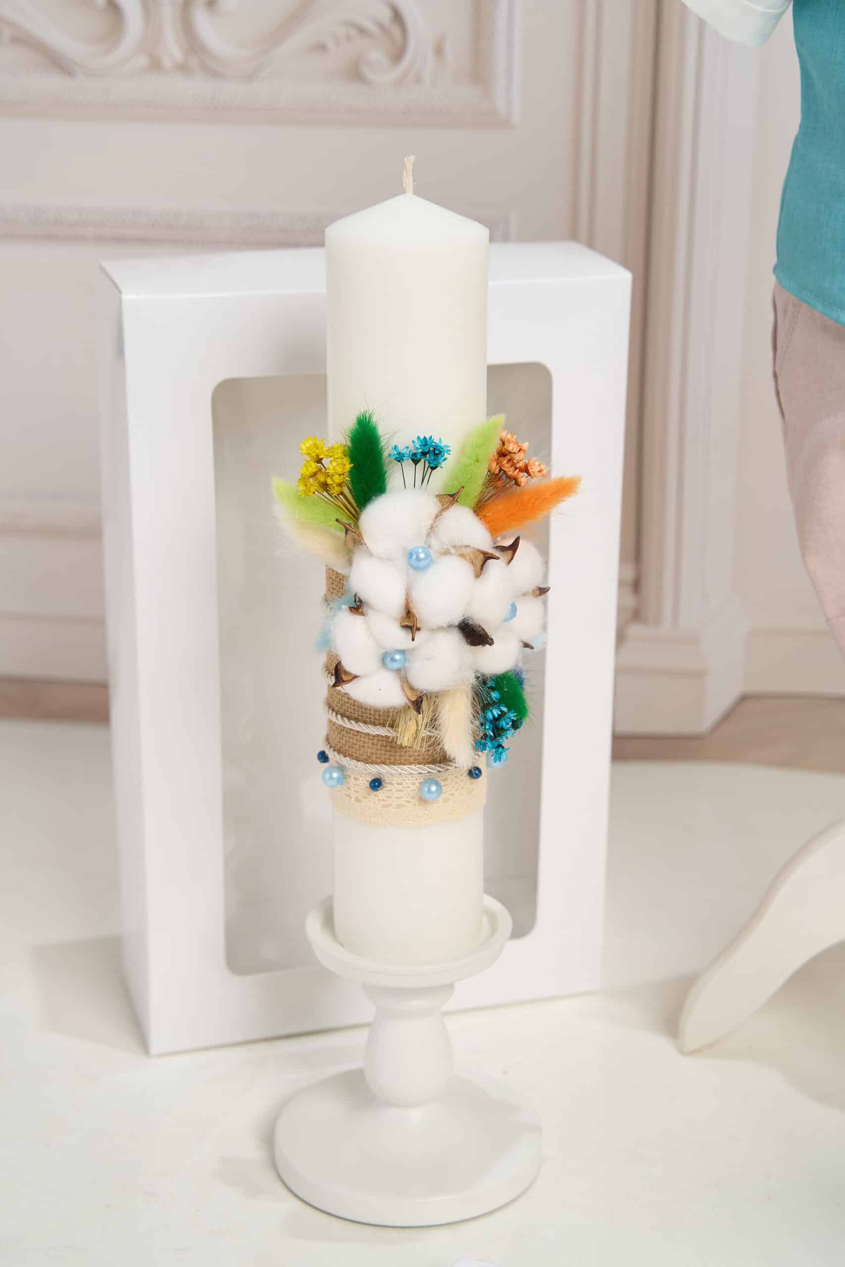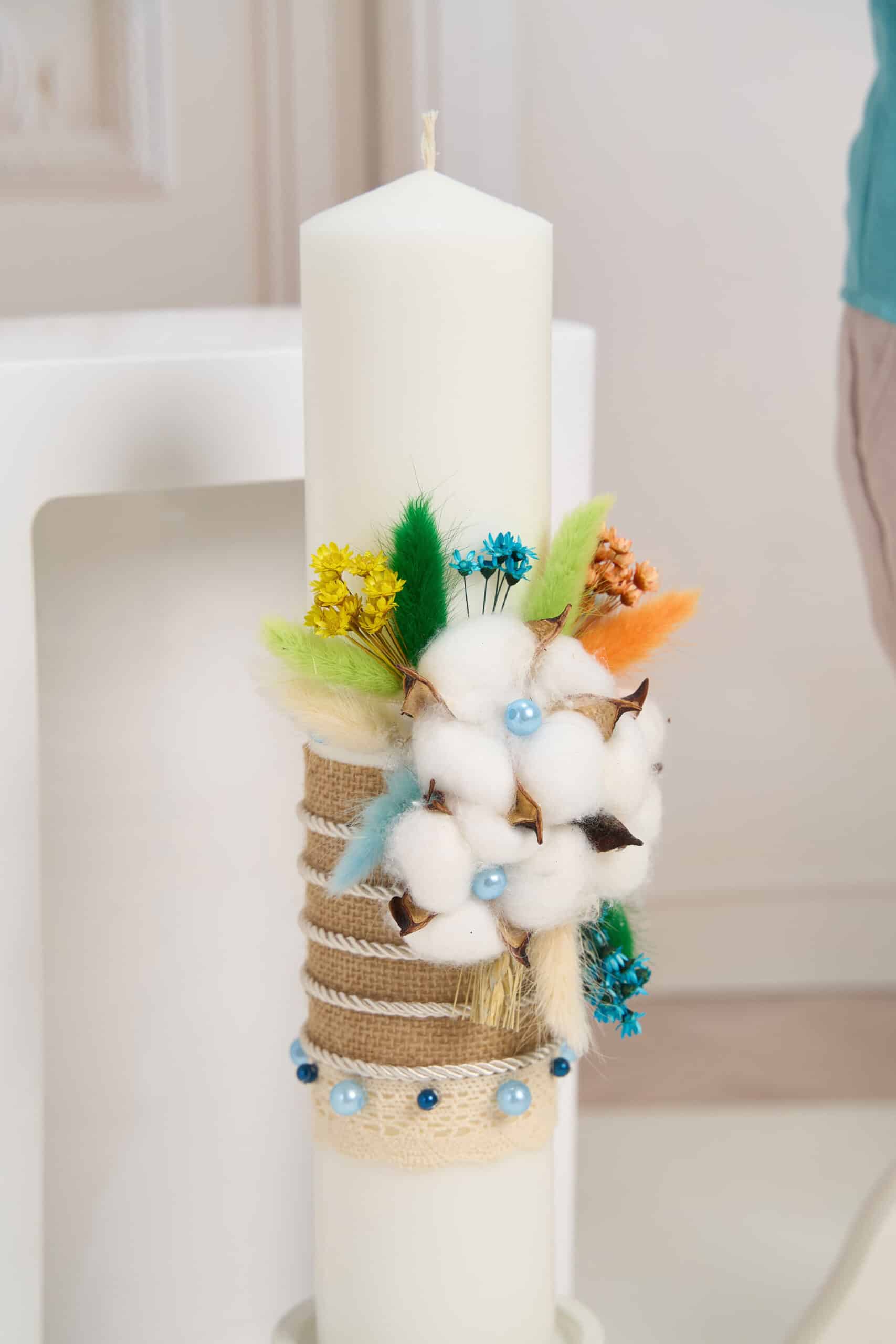 🕯️ Lumânare de botez – Lumânare de botez decorată cu bumbac natural, flori uscate colorate și perle albastre, într-un stil rustic cu accente vesele.
