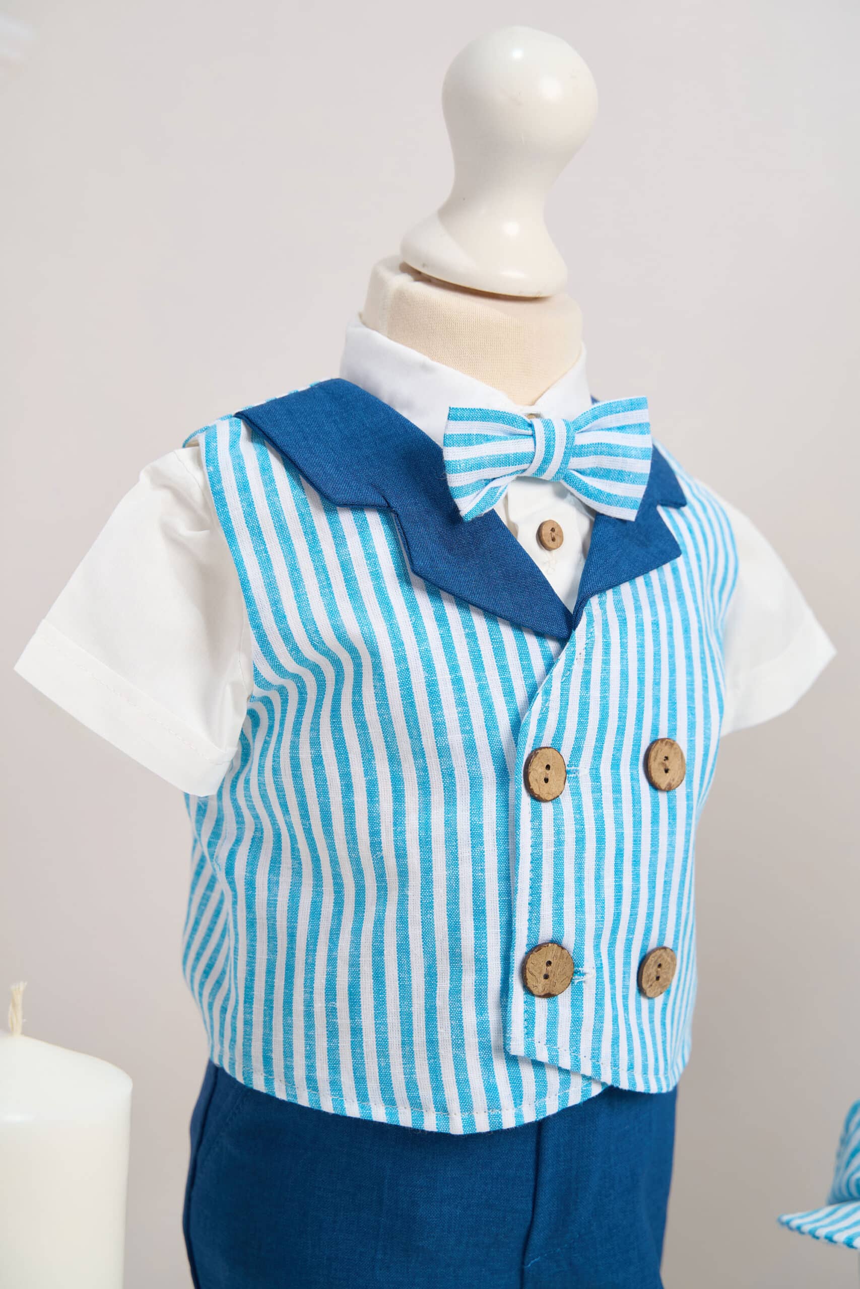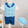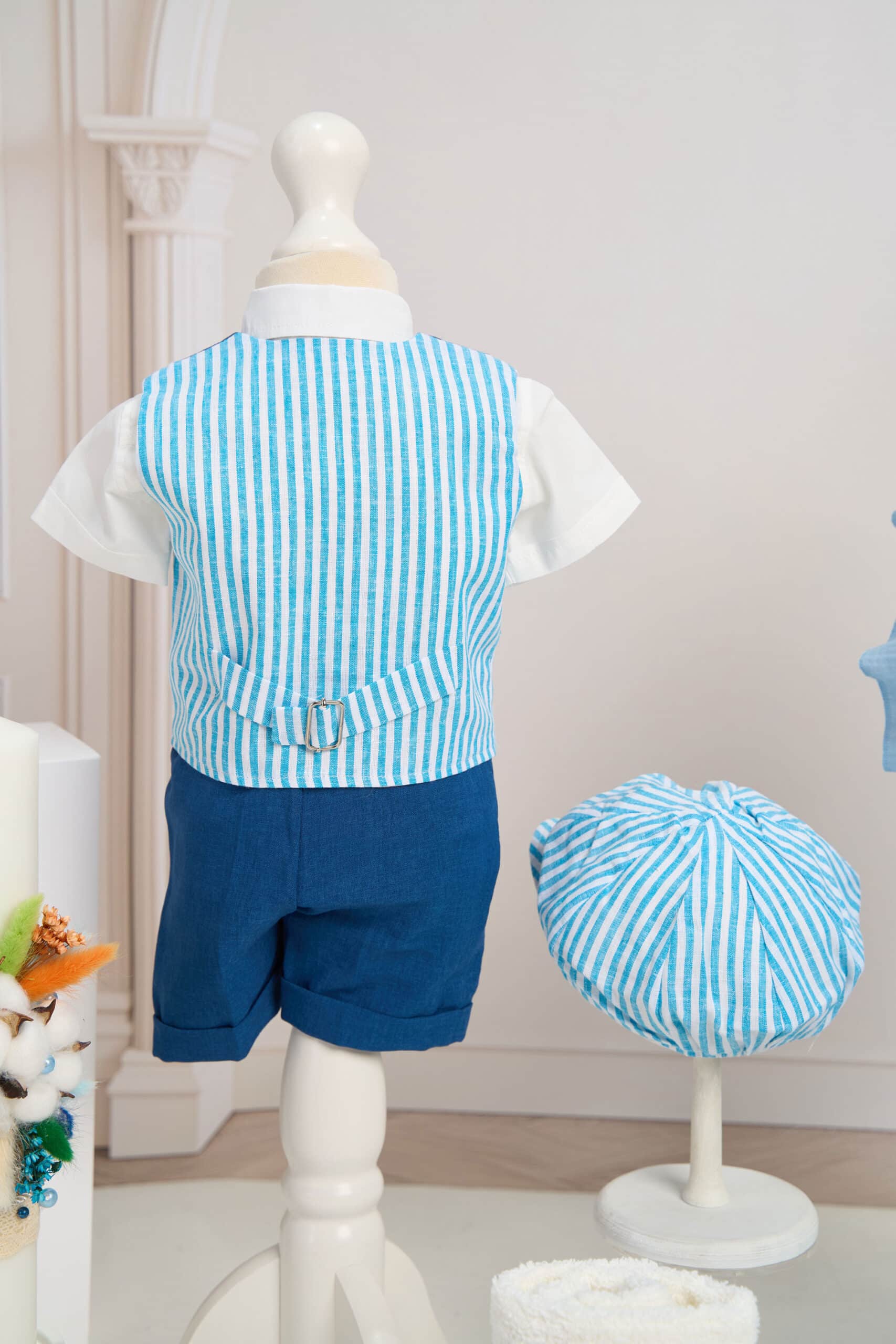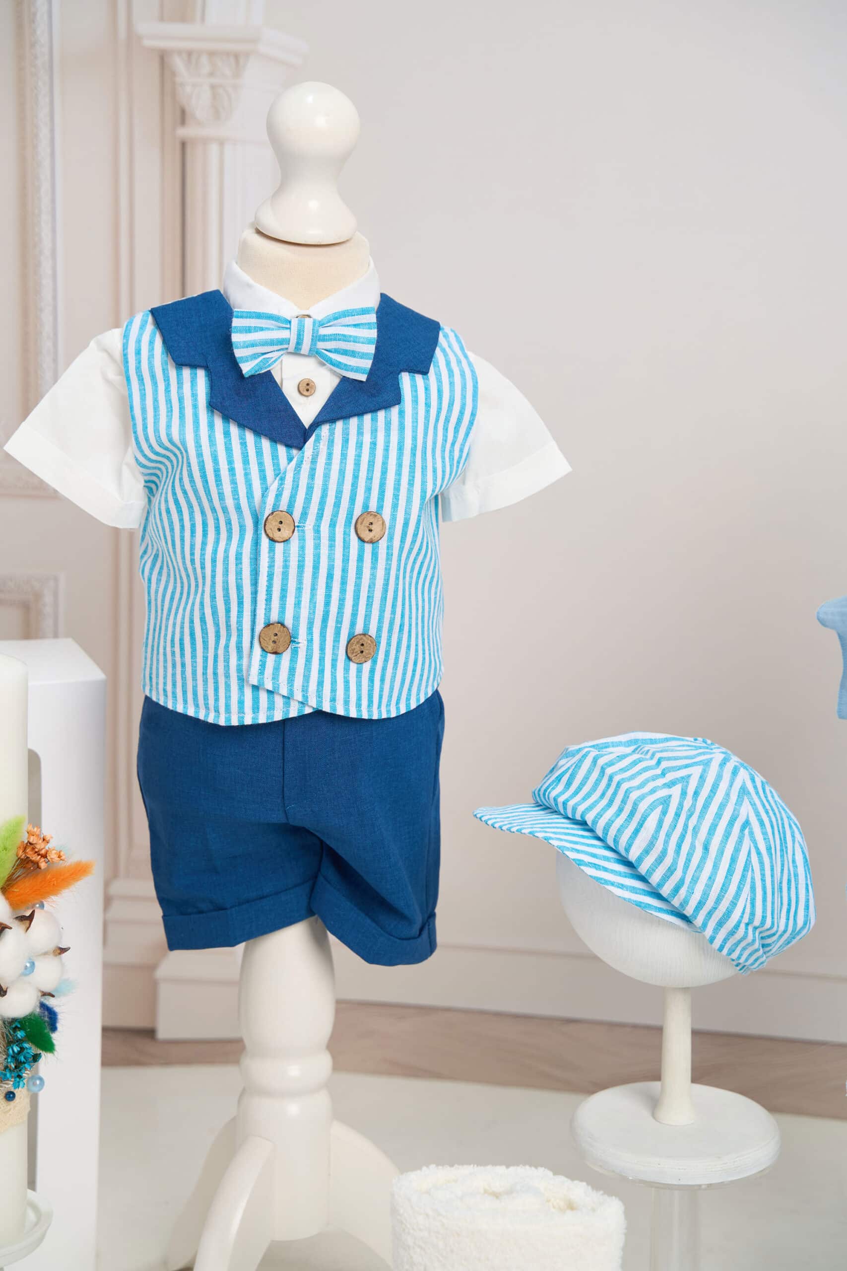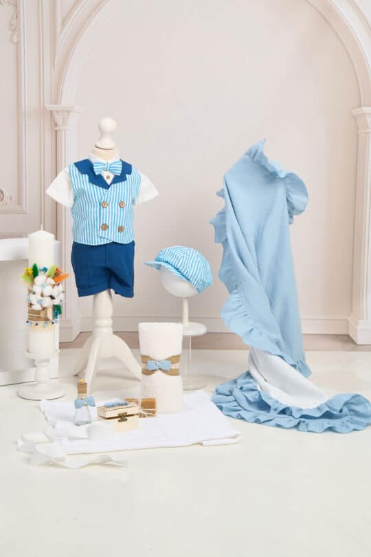 ✂︎ Costum botez băieți – Costumul de botez Hugo Azur, în nuanțe delicate de bleu și bej, este o alegere rafinată și plină de stil pentru micuțul tău în ziua specială.