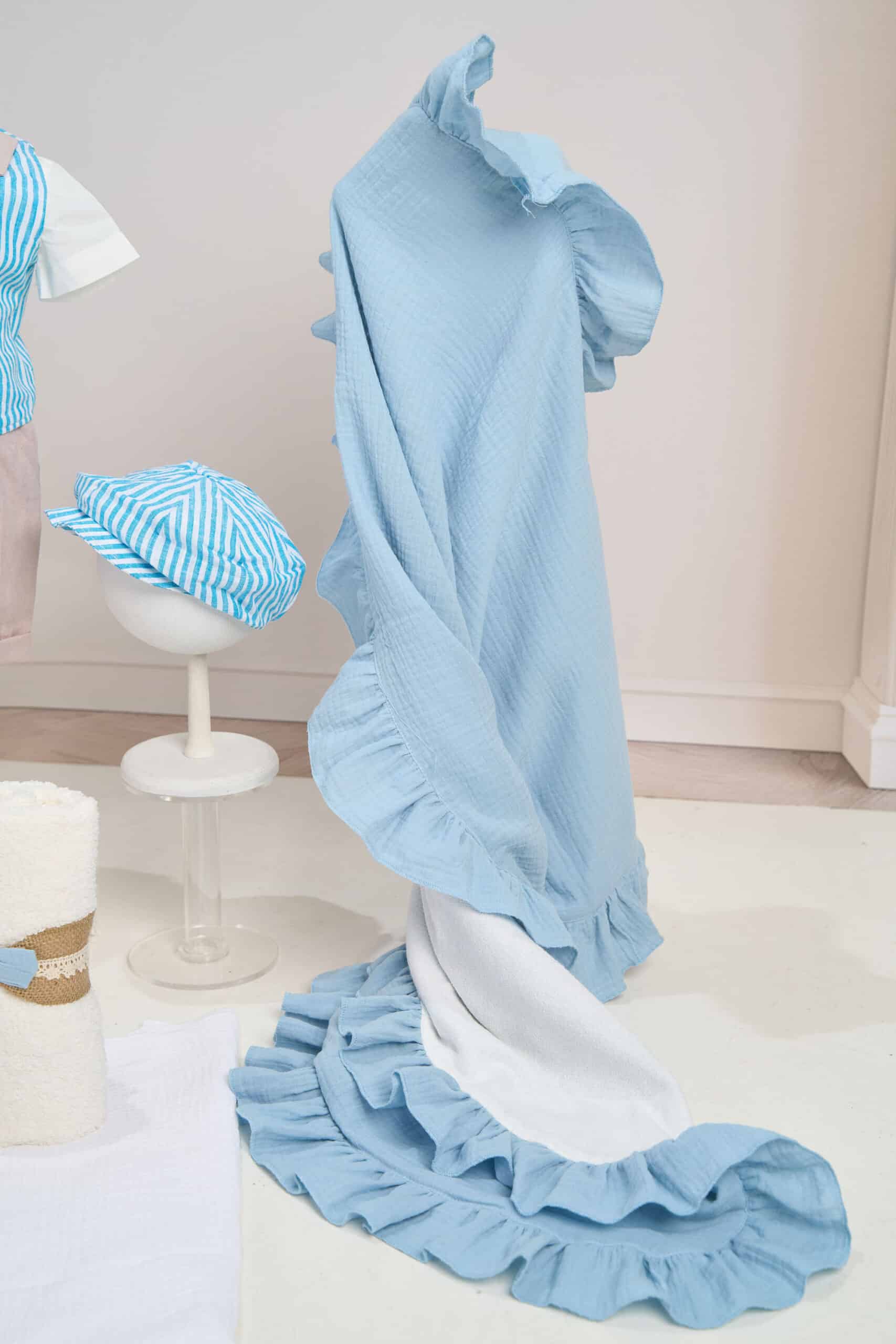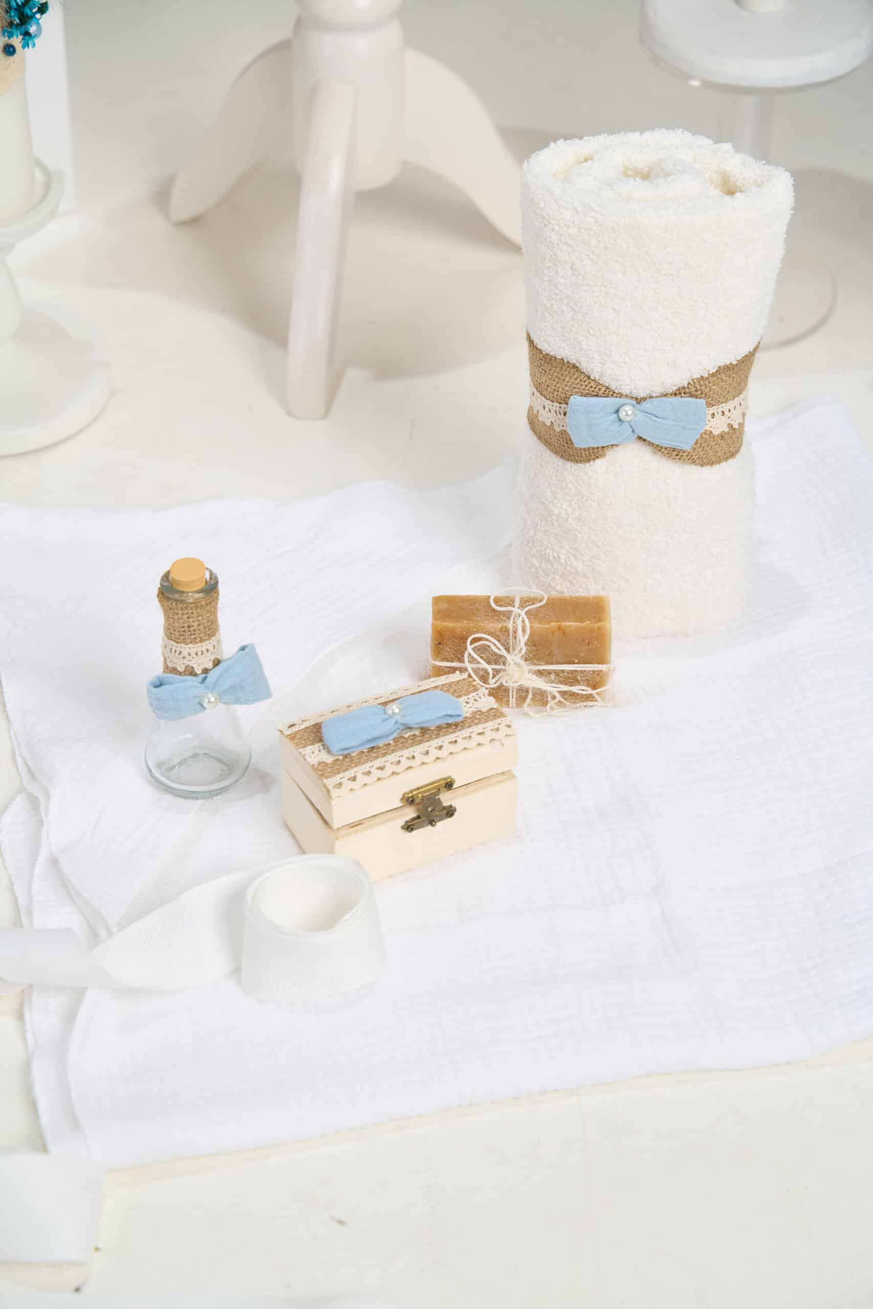 🕊️ Trusou de botez 7 piese –Setul conține pânza de mir cu capișon (125×75 cm), prosop decorat pentru preot (50×90 cm), pled din muselină cu interior tip prosop și capișon brodat (82×82 cm), săpun decorat, sticluță de mir asortată, fașă de 160 cm și cutiuță pentru prima șuviță.