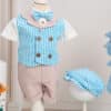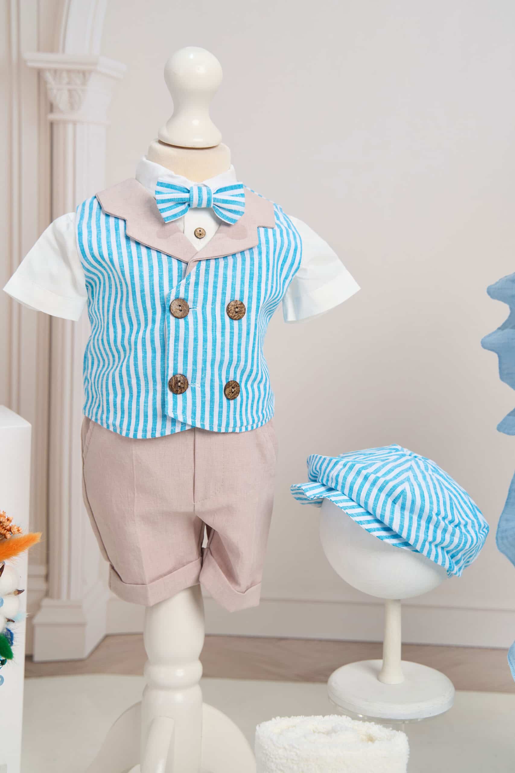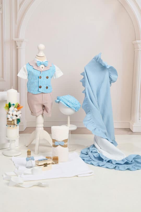 ✂︎ Costum botez băieți – Costumul de botez Hugo Azur, în nuanțe delicate de bleu și bej, este o alegere rafinată și plină de stil pentru micuțul tău în ziua specială.