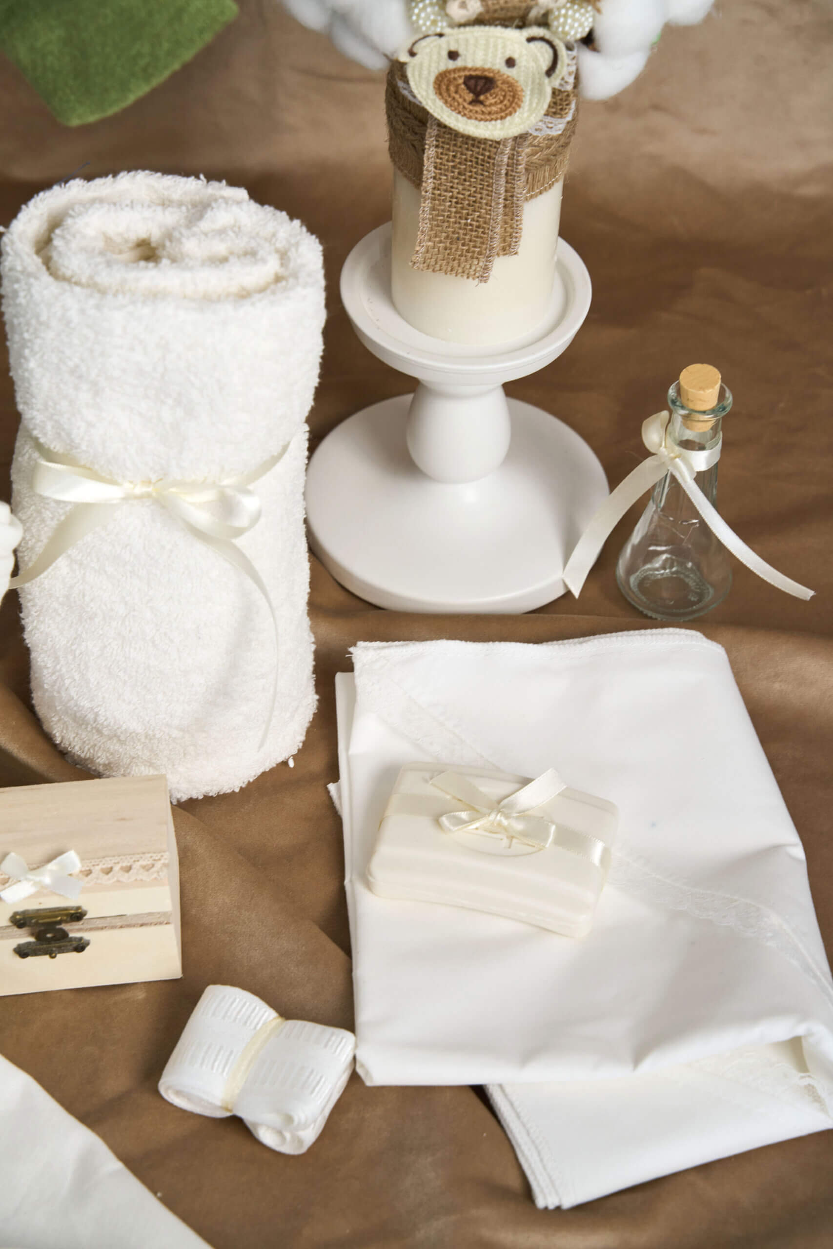 🕊️ Trusou de botez 9 piese – Tot ce ai nevoie într-un singur loc! Prosop cu capișon bebeluș, prosop preot, pânză de mir, fașă, săpun, sticluță mir decorată.
