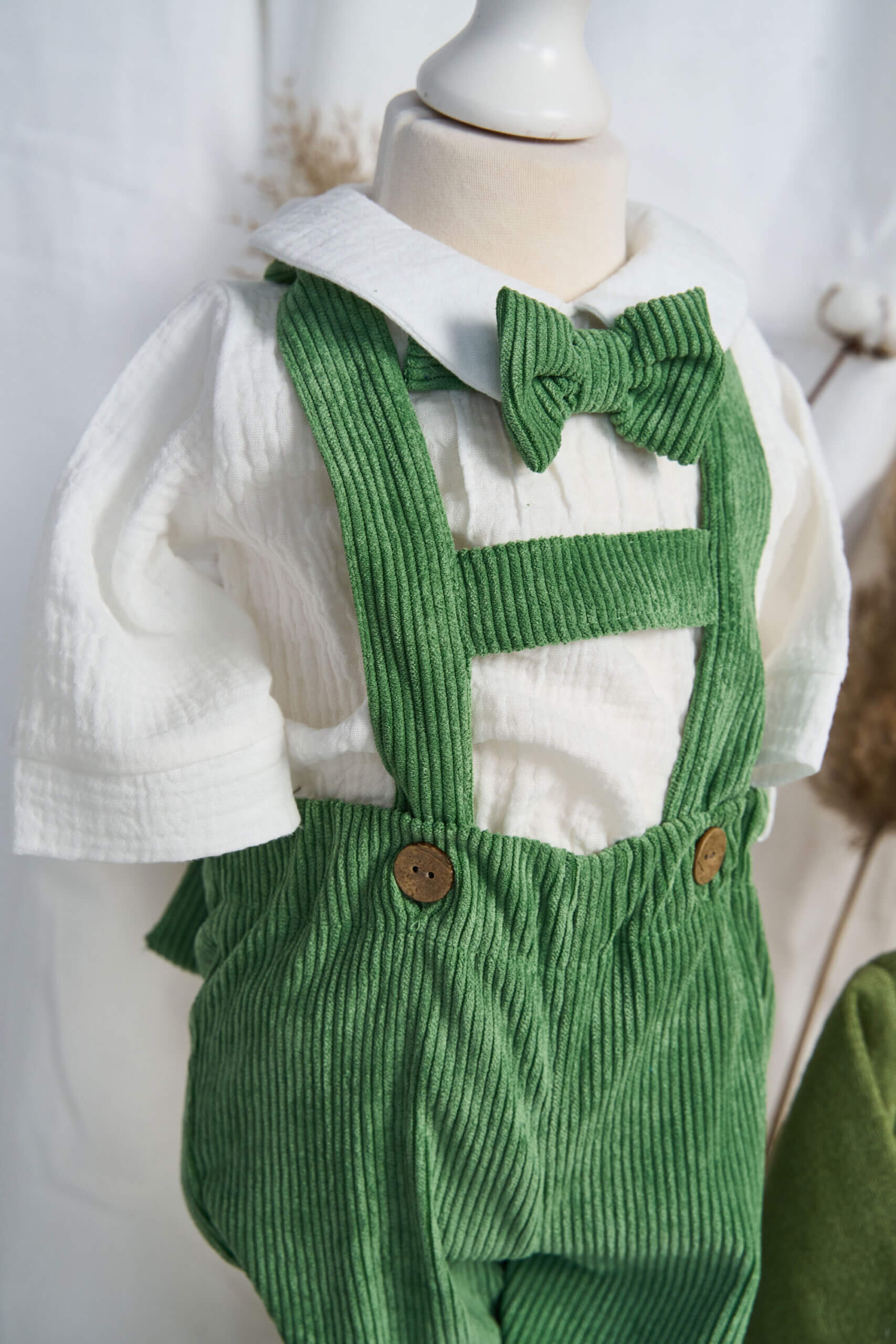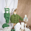 – Set Ioachim – 5 piese: pantaloni cu bretele, cămașă tip body din muselină, papion, șapcă, botoșei