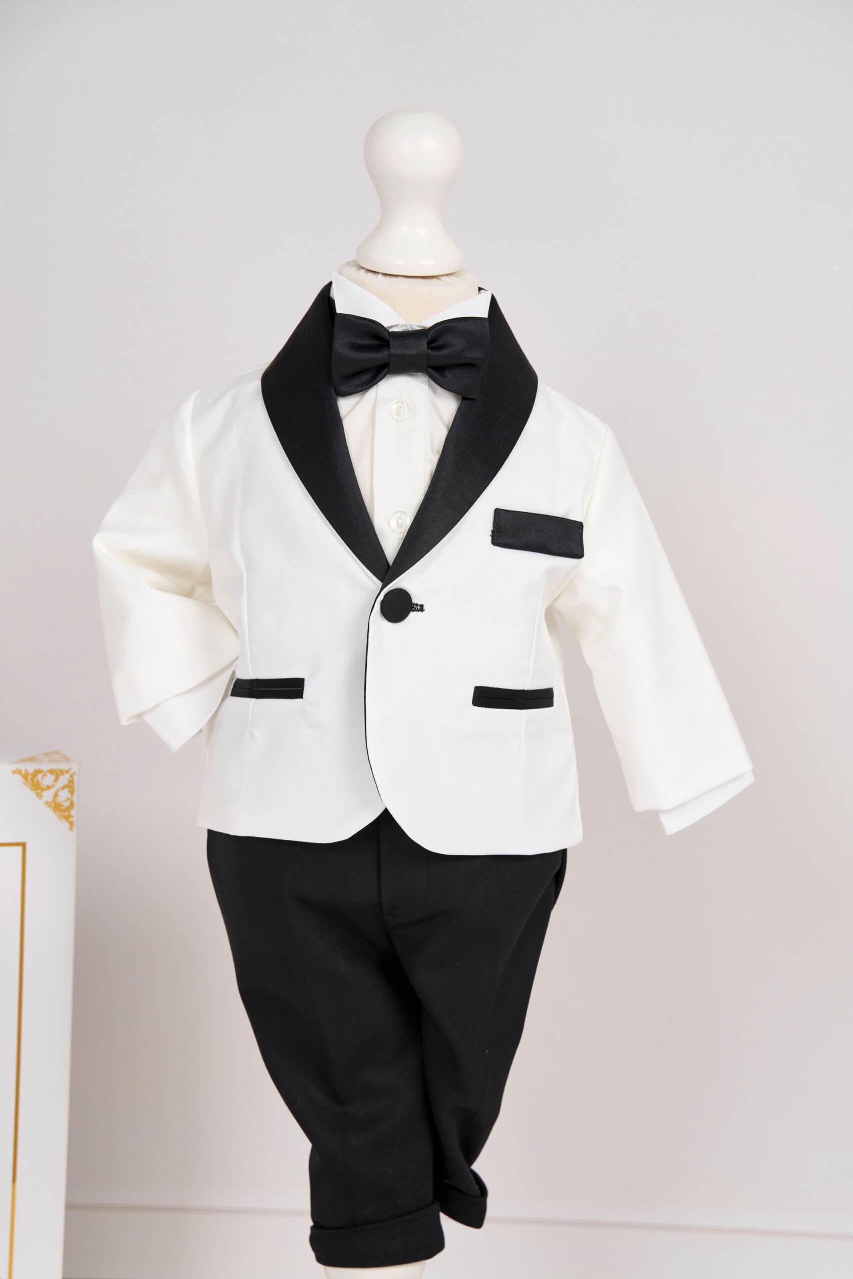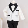 ✂︎ Costum botez băieți – Sacou alb de tip tuxedo, cu reveruri din satin negru și accente negre pe buzunare, accesoriu clasic ca papionul, cămașă albă și pantaloni negri, croiți elegant.