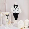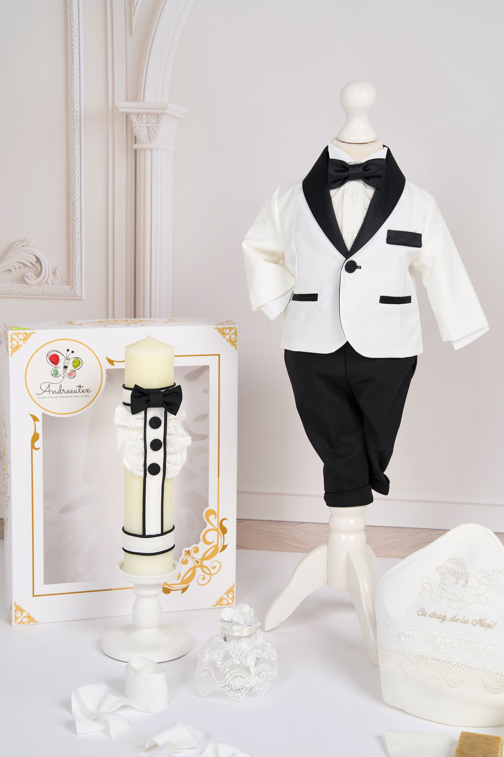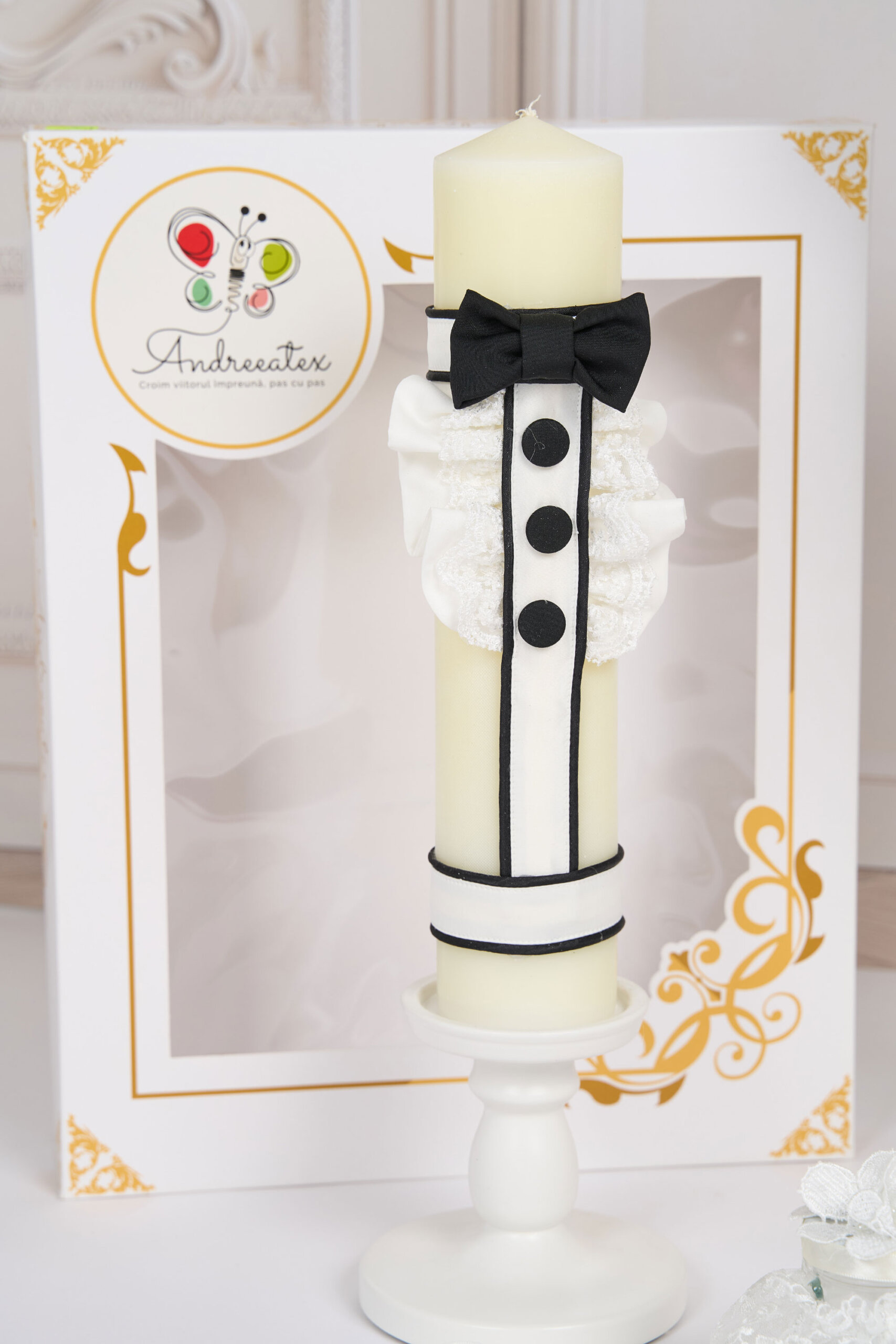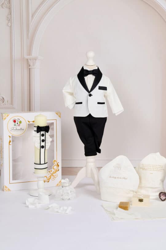 🕯️ Lumânare de botez – Lumânarea este decorată cu elemente asemanatoare costumului, alb si negru creând un contrast elegant.
