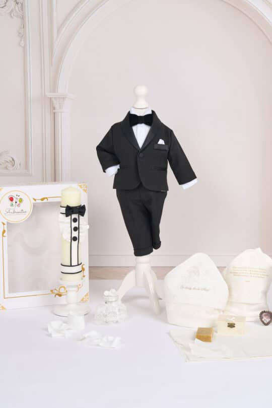 🕯️ Lumânare de botez – Lumânarea este decorată cu elemente asemanatoare costumului, alb si negru creând un contrast elegant.