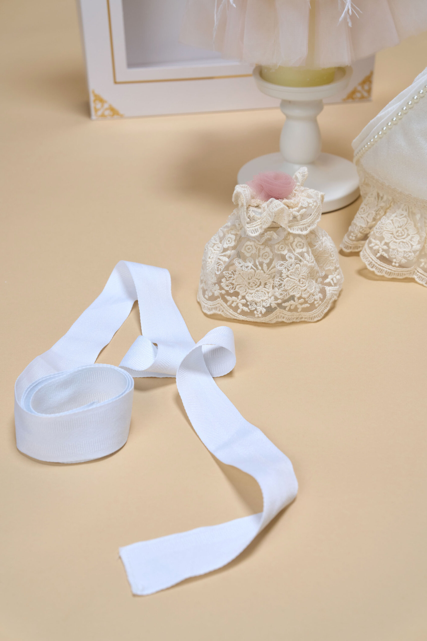 🕯️ Lumânare de botez – Delicată și decorată cu tull roz și perle, gata să lumineze ziua Botezului.