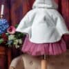 Capa cu glugă este din stofă, cu căptușeală matlasată. Doi nasturei croșetați fac utilizarea și îmbrăcarea micilor prințese foarte facilă.