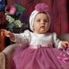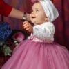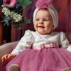 Turbănelul are detaliu pampon-floare din tull și este căptușit cu glat moale pentru a îi proteja capul bebelușei.