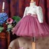 Bustul rochiței și mâneca sunt manufacturate din dantelă înflorată, dantelă fină la atingere.