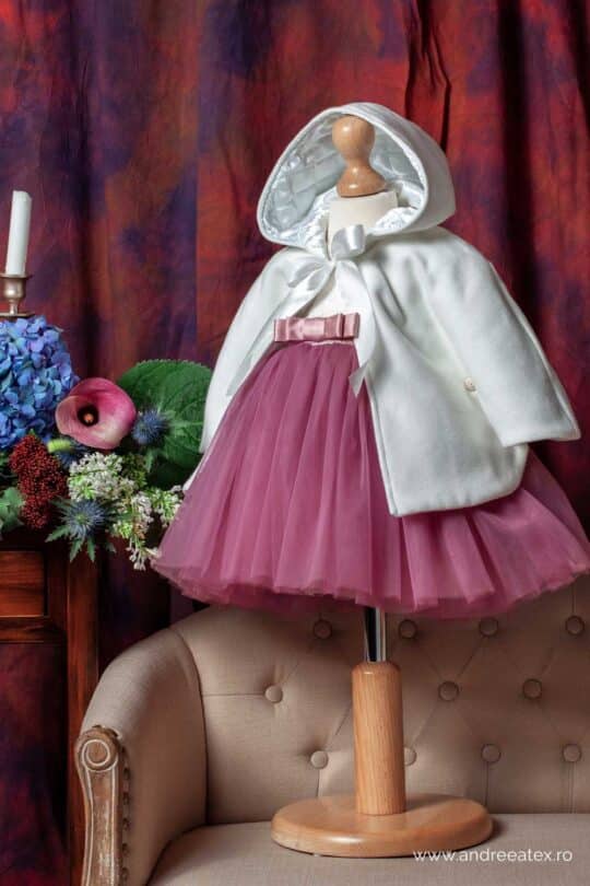 Setul este special creat pentru sezonul rece și este alcătuit din rochiță, capă cu glugă și turbănel.