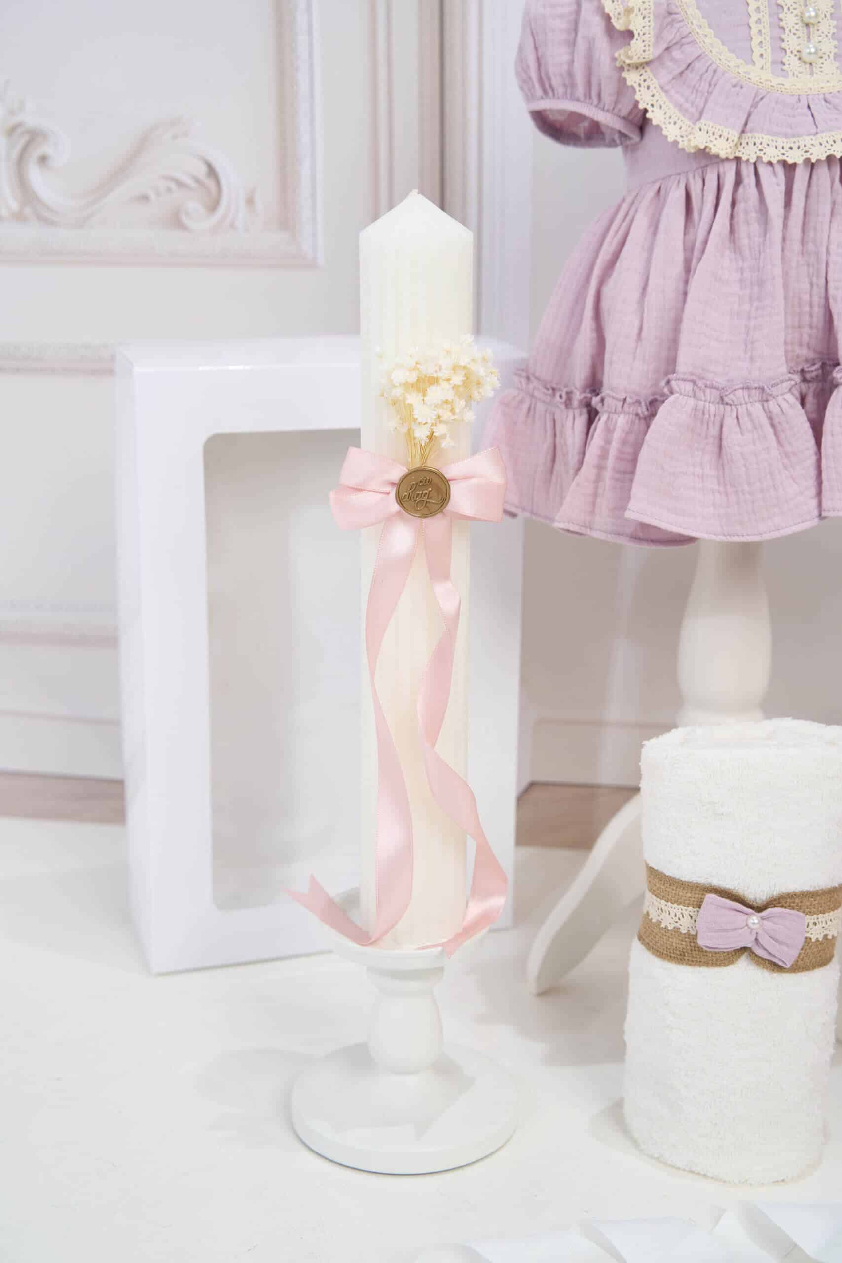 🕯️ Lumânare de botez – Lumânarea de botez este decorată cu floricele uscate, fundă din satin roz pudrat și sigiliu elegant auriu, pentru un stil delicat, modern și natural.