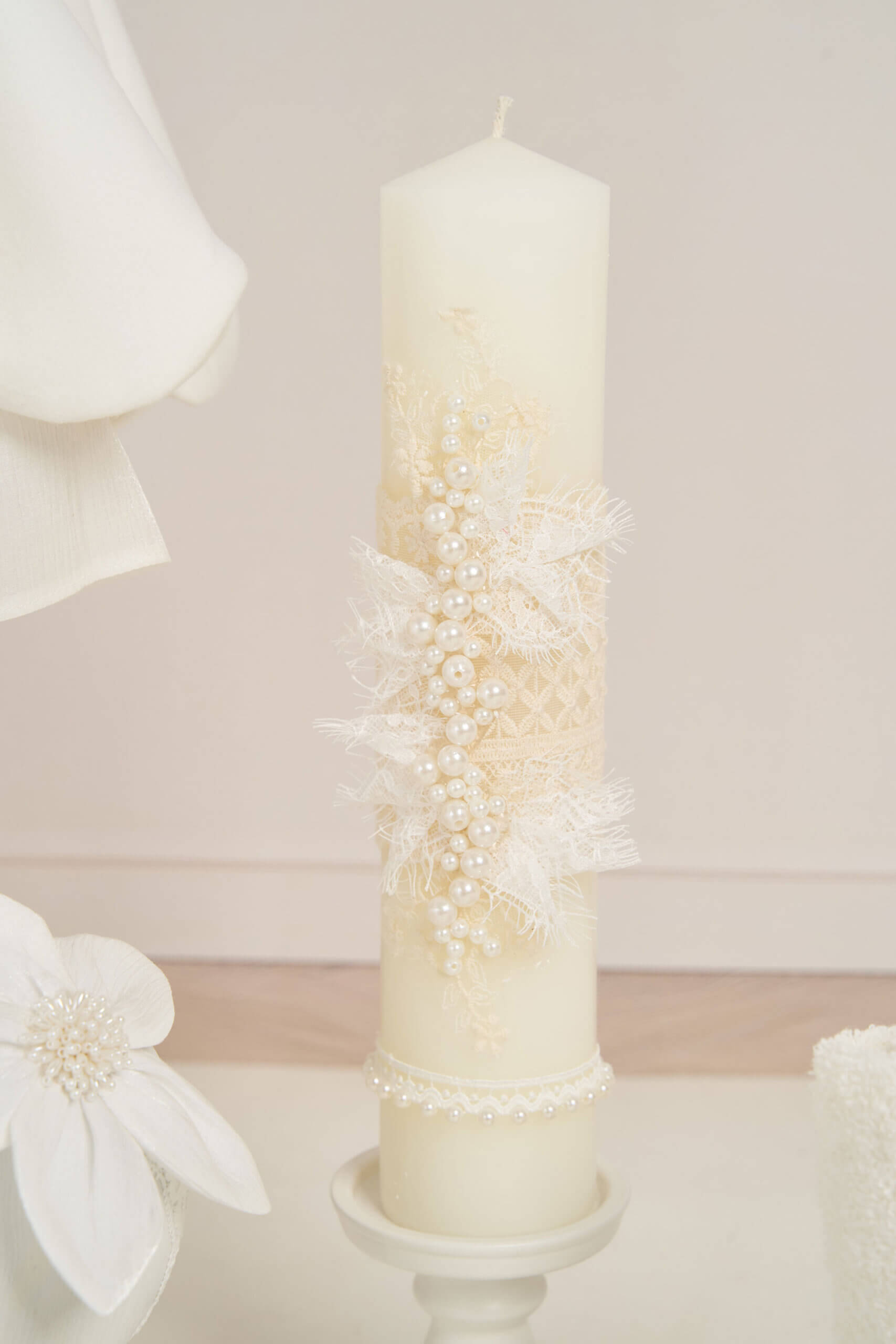 🕯️ Lumânare de botez – Lumânare cu dantelă și perle, elegantă și fină