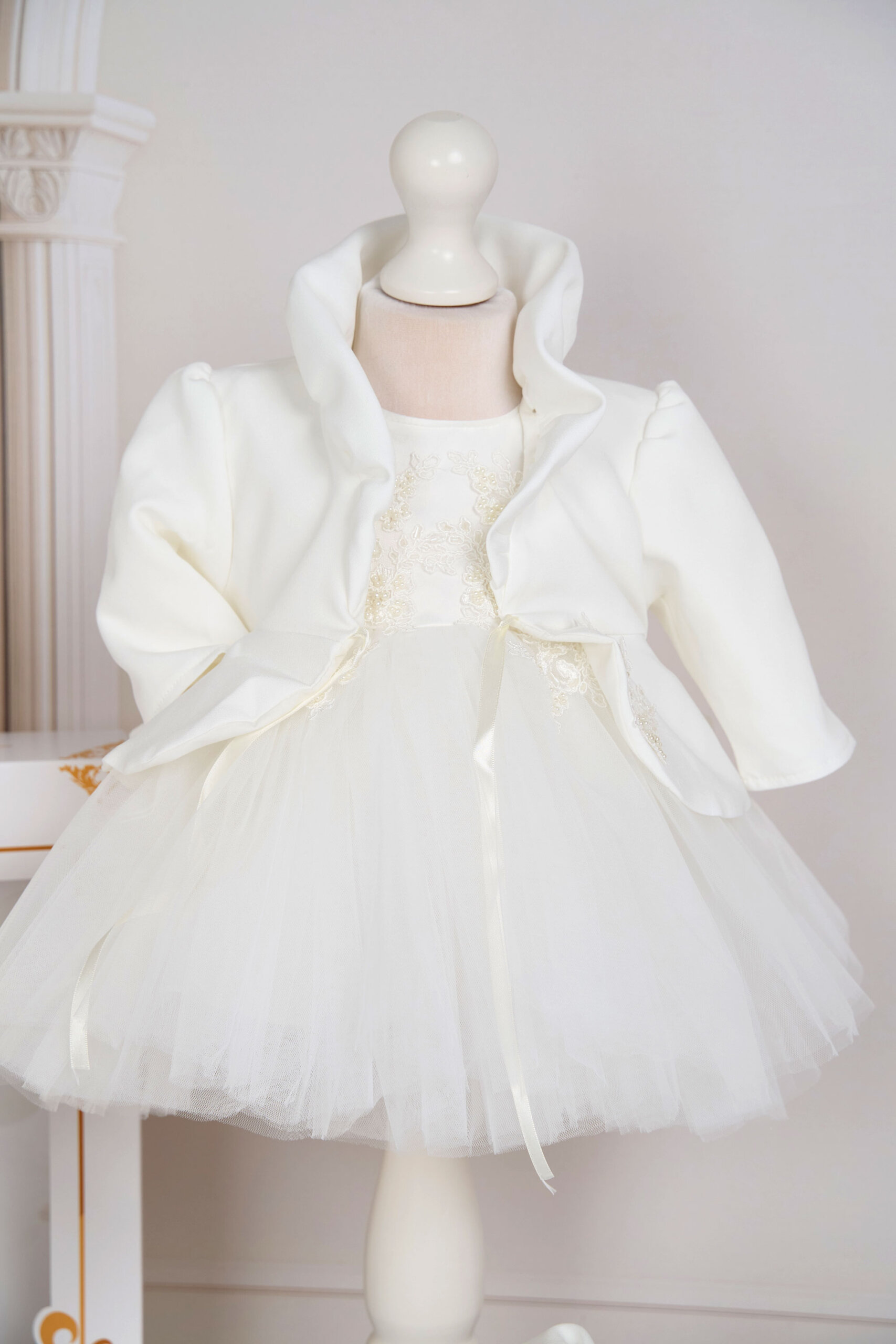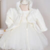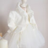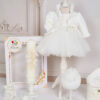 🎀 Set 4 piese – Rochie realizată din tafta ivoire delicată, cu detalii fine de dantelă pe partea superioară și o fustă din tulle vaporoasă. Jachetă cu croi simplu și elegant, completată cu o fundiță din panglică satinată și detalii aplicate din dantelă roz. Turban accesorizat cu floare din tulle ivoire și gogoșari din satin.