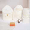 🕊️ Trusou de botez 9 piese – Tot ce ai nevoie într-un singur loc! Prosop cu capișon bebeluș, scutec bumbac cu capișon bebeluș, prosop preot, pânză de mir, fașă, săpun, sticluță mir decorată, cutiuță pentru prima șuviță și mini ramă “mărturie” – pentru poză bebeluș sau iconiță