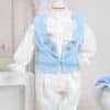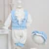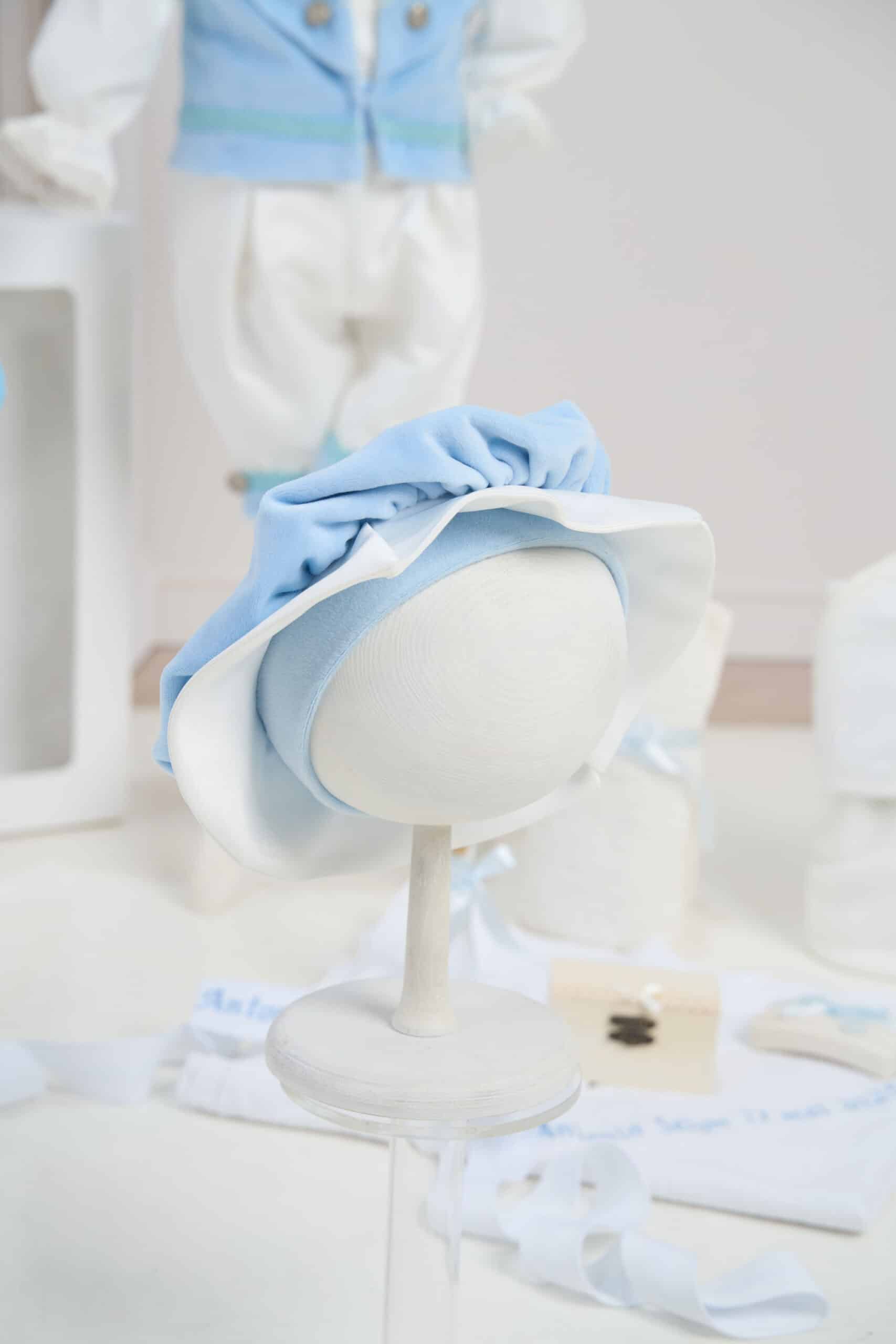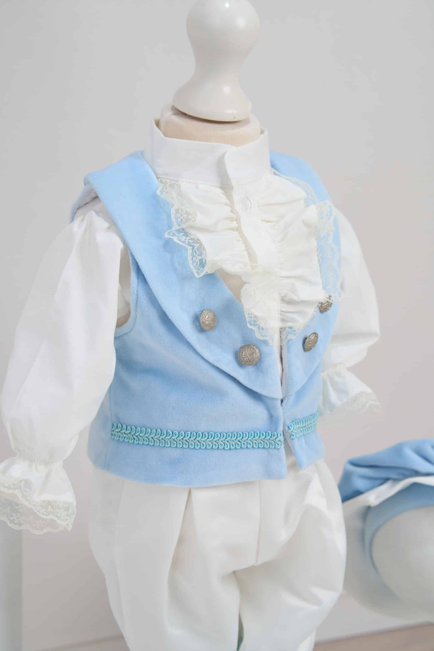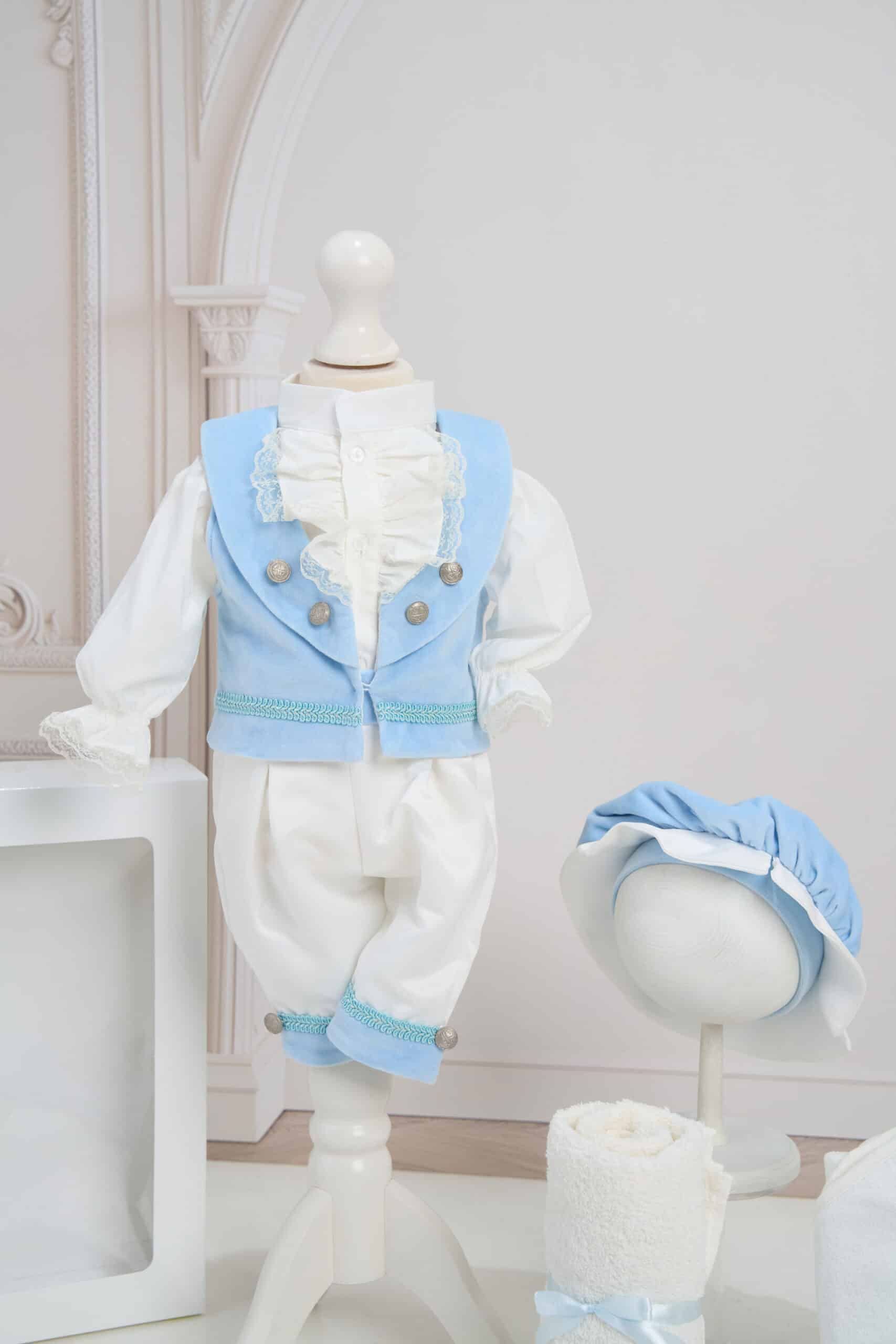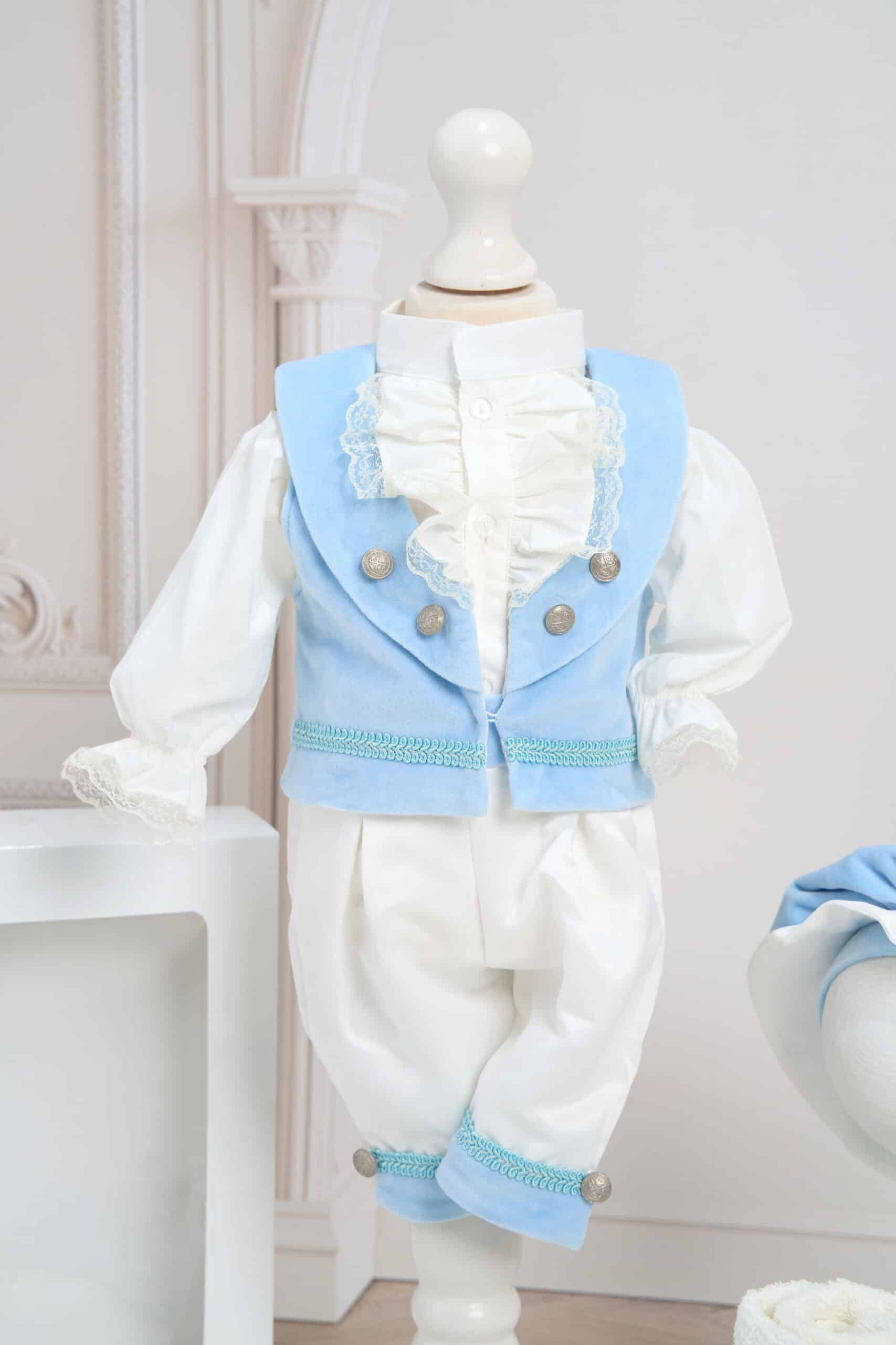 ✂︎ Costum botez băieți – Un costum sofisticat, compus din vestă din catifea bleumarin, cămașă albă cu volane, pantaloni satinați și pălărie asortată