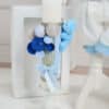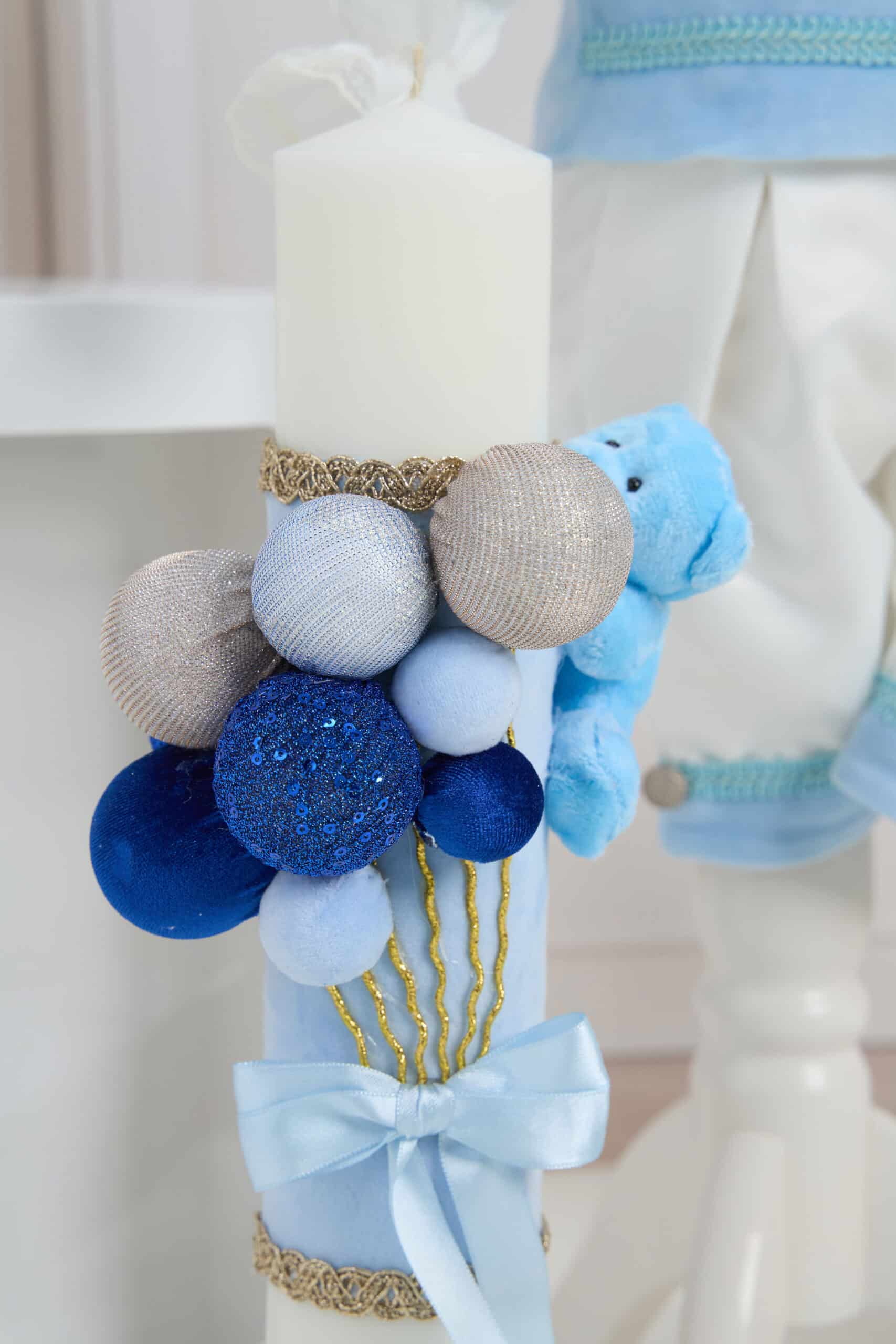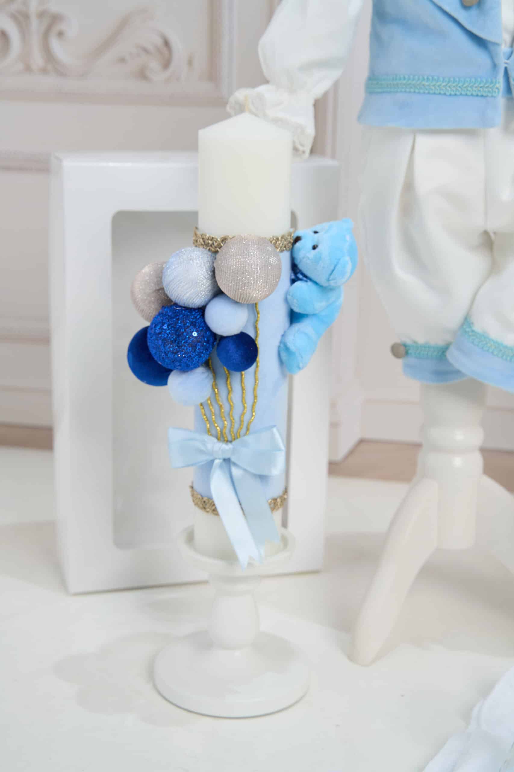 🕯️ Lumânare de botez – Lumânarea de botez are accente de catifea albastru, broderie aurie și panglici de satin și detalii strălucitoare, elemenetele îi aduc un plus de contrast și rafinament.