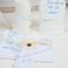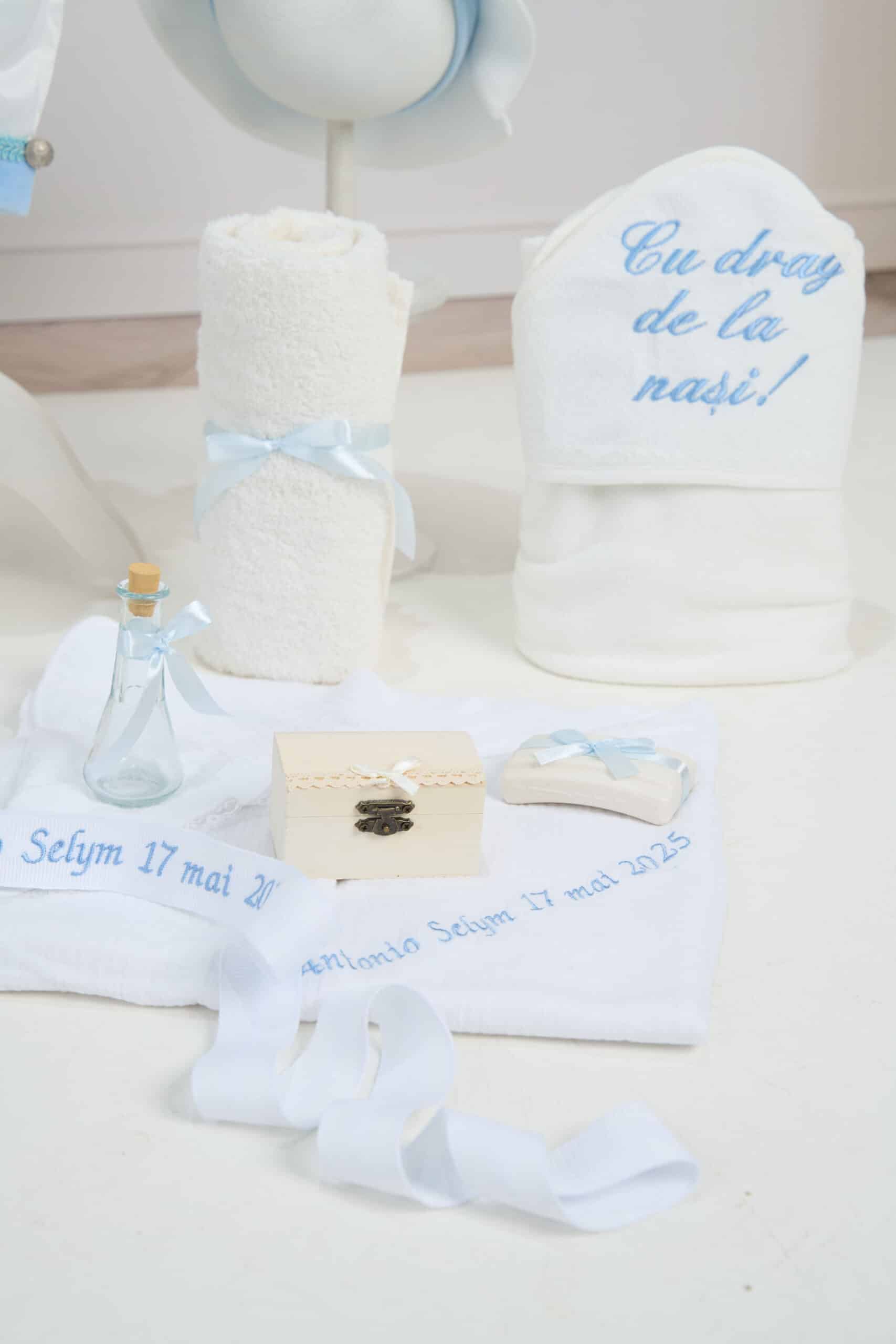 🕊️ Trusou de botez 9 piese – Tot ce ai nevoie într-un singur loc! Prosop cu capișon bebeluș, scutec bumbac cu capișon bebeluș, prosop preot, pânză de mir, fașă, săpun, sticluță mir decorată, cutiuță pentru prima șuviță și mini ramă “mărturie” – pentru poză bebeluș sau iconiță.