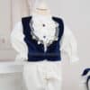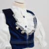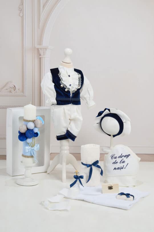 ✂︎ Costum botez băieți – Un costum sofisticat, compus din vestă din catifea bleumarin, cămașă albă cu volane, pantaloni satinați și pălărie asortată