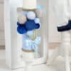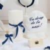 🕯️ Lumânare de botez – Lumânarea de botez are accente de catifea albastru, broderie aurie și panglici de satin și detalii strălucitoare, elemenetele îi aduc un plus de contrast și rafinament.