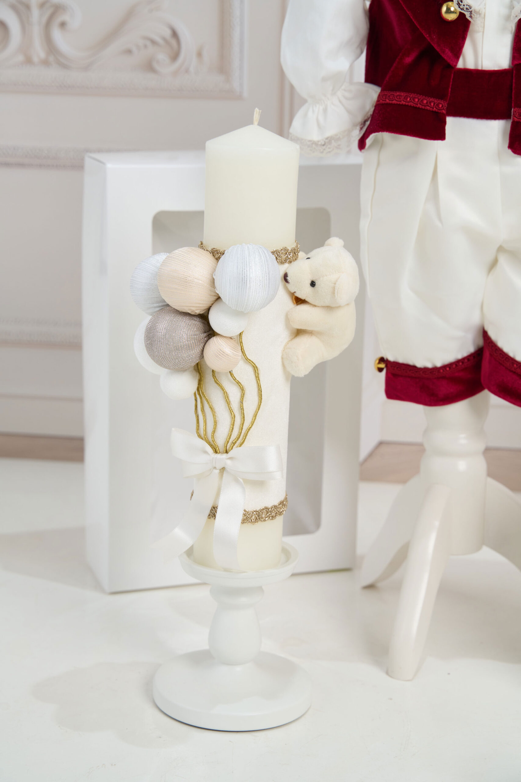 🕯️ Lumânare de botez – Lumânarea de botez are accente de catifea albastru, broderie aurie și panglici de satin și detalii strălucitoare, elemenetele îi aduc un plus de contrast și rafinament.